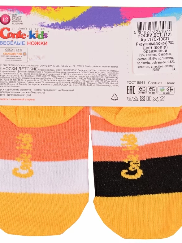 Круглогодичные укороченные детские носки, цвет оранжевый, разного цвета, состав: 72% хлопок, 25,5% полиамид, 2,5% эластан, фабричный артикул 17С-10СП. Производитель «Conte, Беларусь» под брендом «Conte».