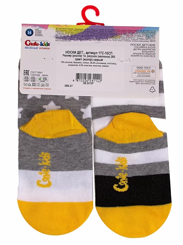 Круглогодичные укороченные детские носки, цвет серый, прикольные, состав: 72% хлопок, 25.5% полиамид, 2.5% эластан, фабричный артикул 17С-10СП. Производитель «Conte, Беларусь» под брендом «Conte».