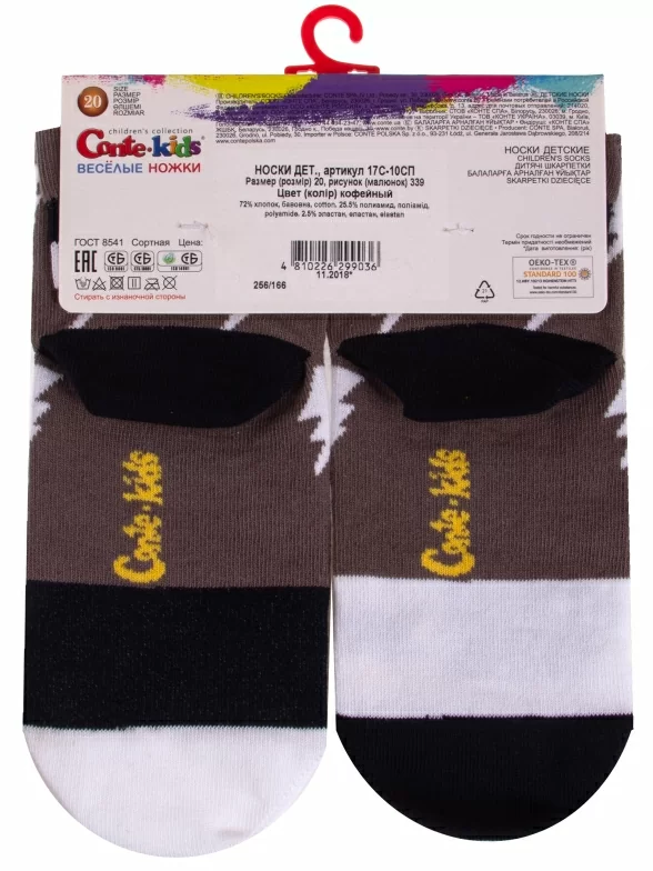 Круглогодичные укороченные детские носки, цвет коричневый, прикольные, состав: 72% хлопок, 25.5% полиамид, 2.5% эластан, фабричный артикул 17С-10СП. Производитель «Conte, Беларусь» под брендом «Conte».