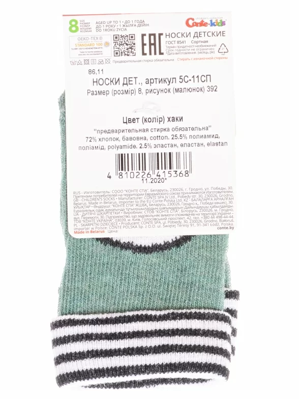 Круглогодичные укороченные детские носки, цвет хаки, разного цвета, состав: 72% хлопок, 25.5% полиамид, 2.5% эластан, фабричный артикул 5С-11СП. Производитель «Conte, Беларусь» под брендом «Conte».