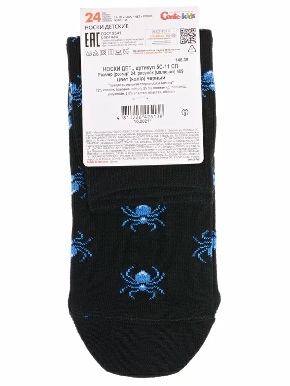 Круглогодичные укороченные детские носки, цвет черный, прикольные, состав: 72% хлопок, 25.5% полиамид, 2.5% эластан, фабричный артикул 5С-11СП. Производитель «Conte, Беларусь» под брендом «Conte».