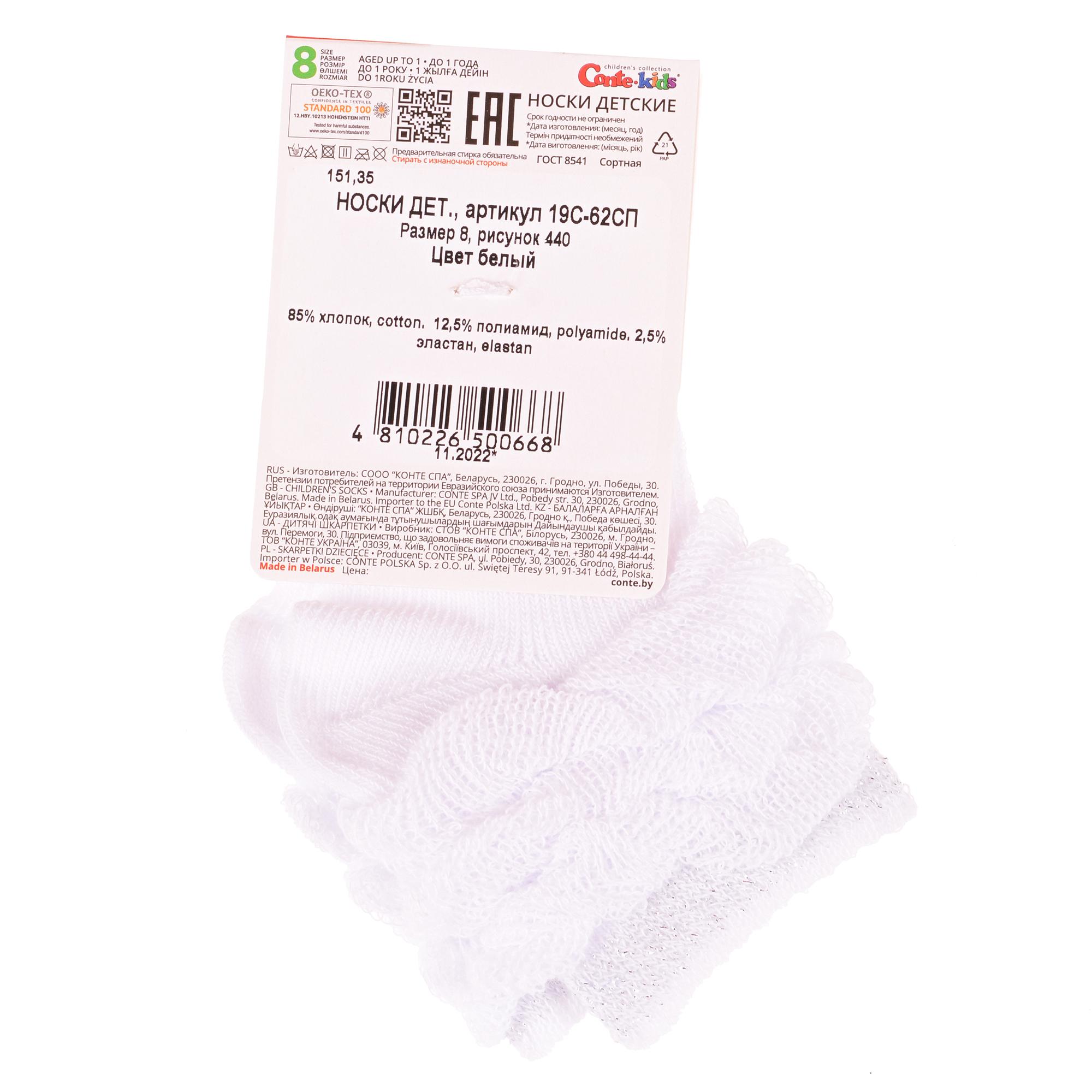 Круглогодичные укороченные детские носки, цвет белый, с отворотом, состав: 85% хлопок, 12.5% полиамид, 2.5% эластан, нить люрекса, фабричный артикул 19С-62СП. Производитель «Conte, Беларусь» под брендом «Conte».