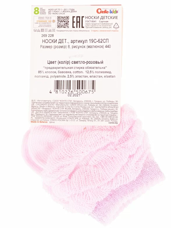 Круглогодичные укороченные детские носки, цвет розовый, с отворотом, состав: 85% хлопок, 12.5% полиамид, 2.5% эластан, нить люрекса, фабричный артикул 19С-62СП. Производитель «Conte, Беларусь» под брендом «Conte».