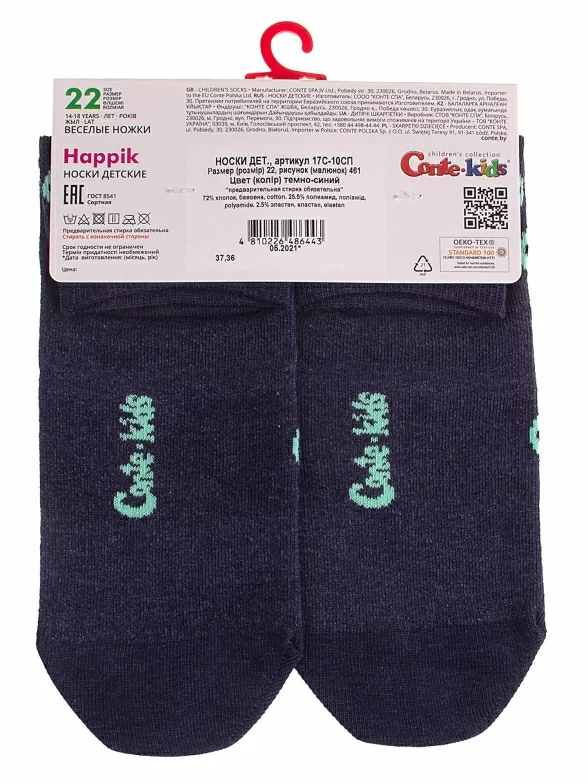 Круглогодичные укороченные детские носки, цвет темно-синий, прикольные, состав: 72% хлопок, 25,5% полиамид, 2,5% эластан, фабричный артикул 17С-10СП. Производитель «Conte, Беларусь» под брендом «Conte».