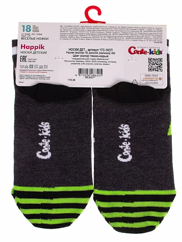 Круглогодичные укороченные детские носки, цвет темно-серый, прикольные, состав: 72% хлопок, 25.5% полиамид, 2.5% эластан, фабричный артикул 17С-10СП. Производитель «Conte, Беларусь» под брендом «Conte».