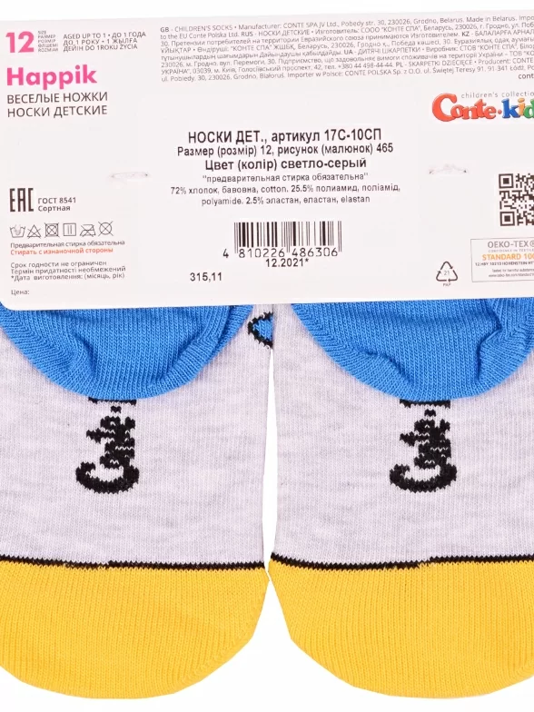 Круглогодичные укороченные детские носки, цвет светло-серый, прикольные, состав: 72% хлопок, 25.5% полиамид, 2.5% эластан, фабричный артикул 17С-10СП. Производитель «Conte, Беларусь» под брендом «Conte».