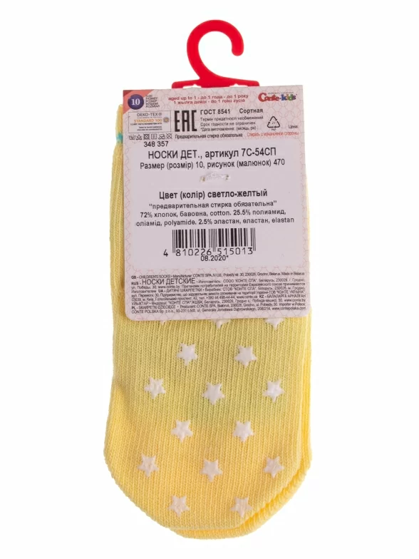 Круглогодичные укороченные детские носки, цвет желтый, с нескользящей стопой, состав: 72% хлопок, 25.5% полиамид, 2.5% эластан, фабричный артикул 7С-54СП. Производитель «Conte, Беларусь» под брендом «Conte».