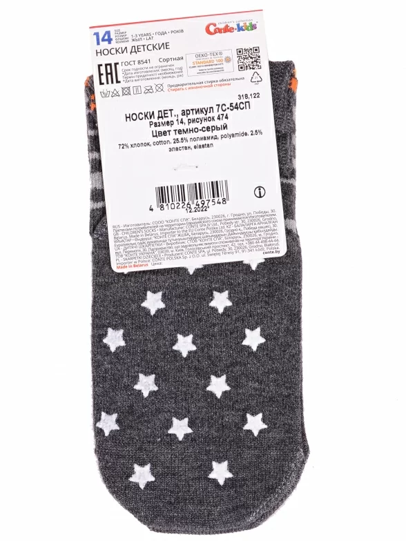 Круглогодичные укороченные детские носки, цвет темно-серый, с нескользящей стопой, состав: 72% хлопок, 25.5% полиамид, 2.5% эластан, фабричный артикул 7С-54СП. Производитель «Conte, Беларусь» под брендом «Conte».