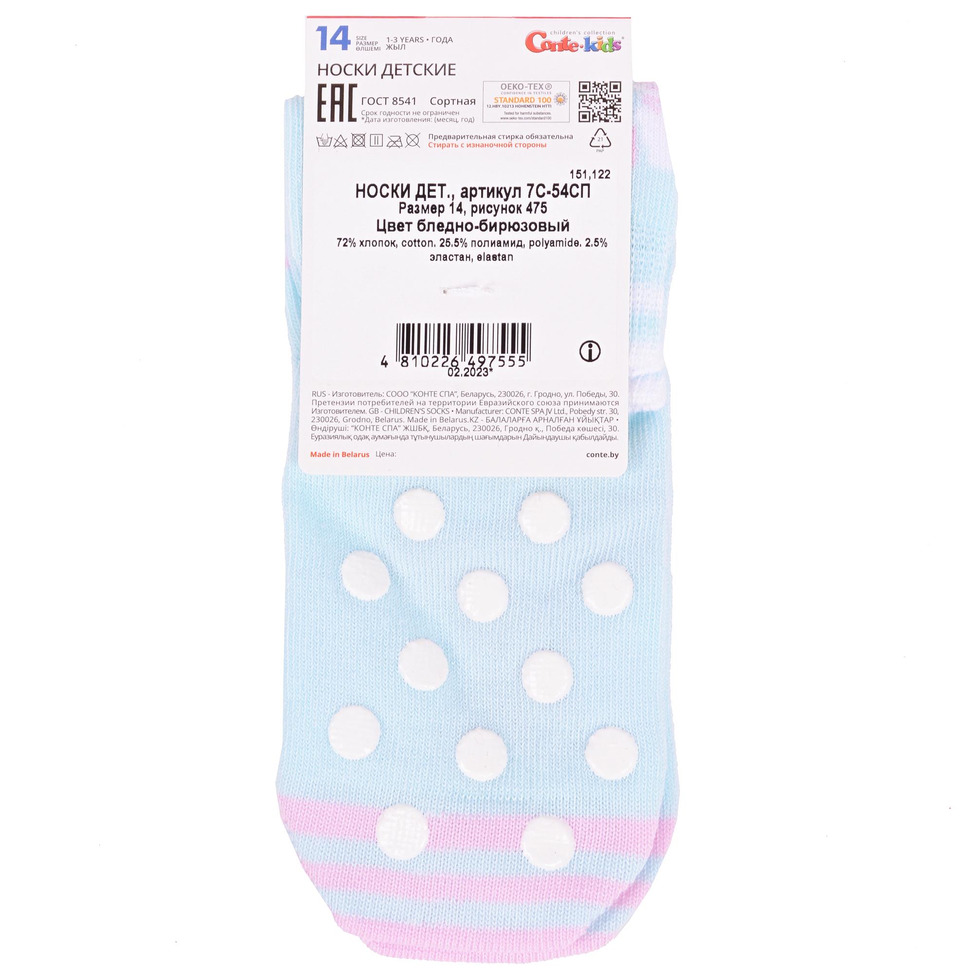 Круглогодичные укороченные детские носки, цвет бирюзовый, с нескользящей стопой, состав: 72% хлопок, 25.5% полиамид, 2.5% эластан, фабричный артикул 7С-54СП. Производитель «Conte, Беларусь» под брендом «Conte».