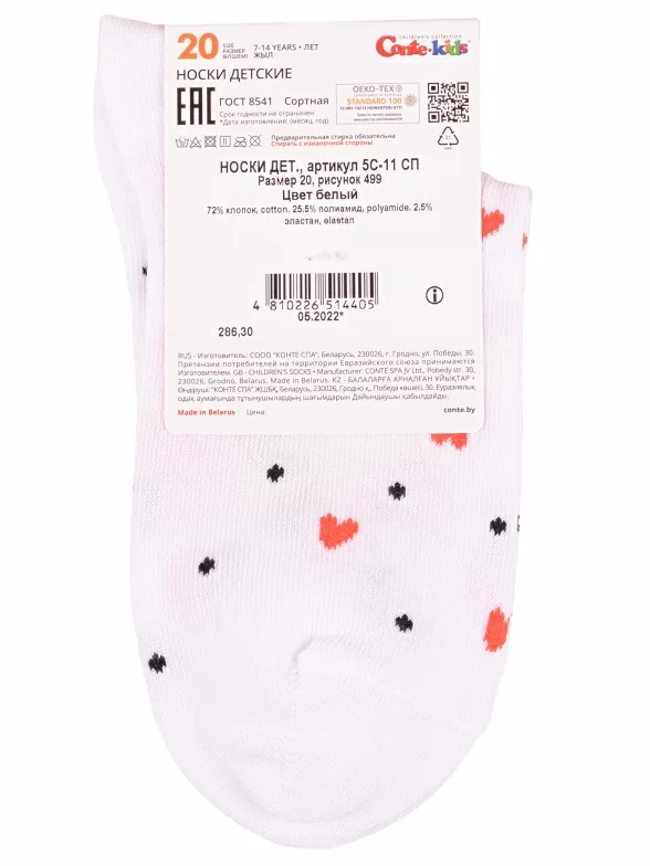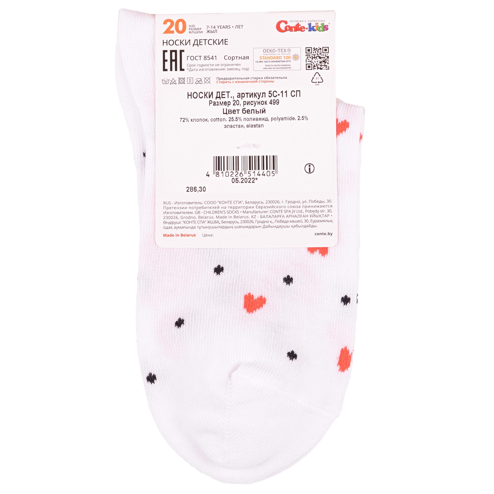 Круглогодичные укороченные детские носки, цвет белый, прикольные, состав: 72% хлопок, 25,5% полиамид, 2,5% эластан, фабричный артикул 5С-11СП. Производитель «Conte, Беларусь» под брендом «Conte».