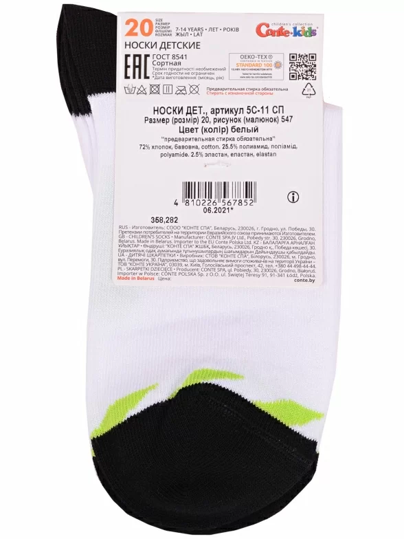 Круглогодичные укороченные детские носки, цвет белый, прикольные, состав: 72% хлопок, 25.5% полиамид, 2.5% эластан, фабричный артикул 5С-11СП. Производитель «Conte, Беларусь» под брендом «Conte».