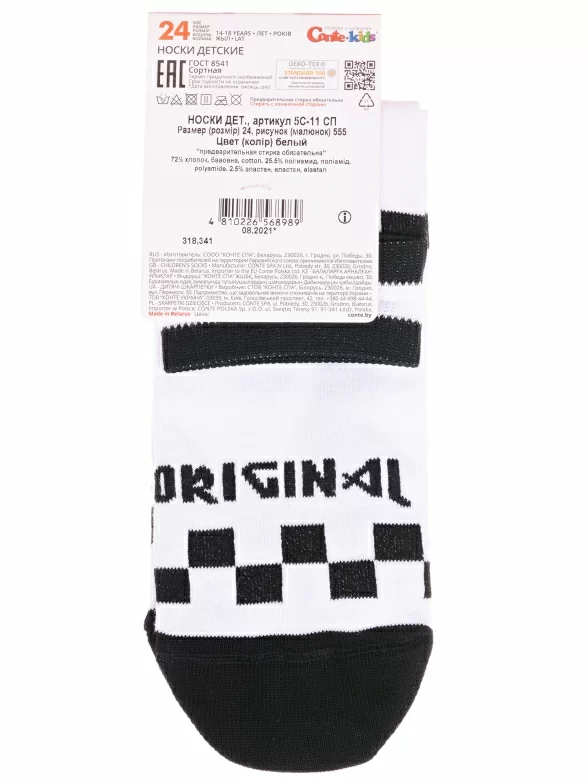 Круглогодичные укороченные детские носки, цвет белый, прикольные, состав: 72% хлопок, 25,5% полиамид, 2,5% эластан, фабричный артикул 5С-11СП. Производитель «Conte, Беларусь» под брендом «Conte».