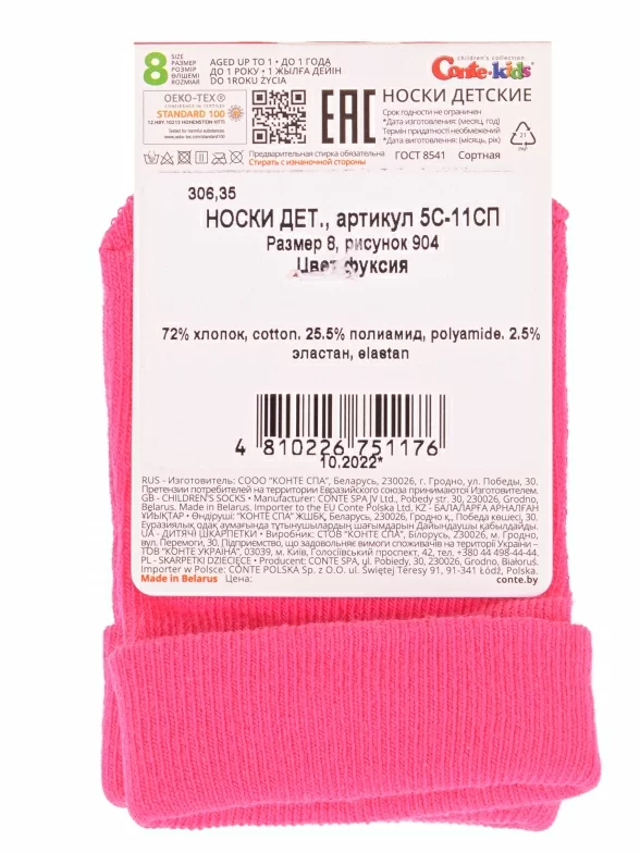 Круглогодичные укороченные детские носки, цвет фуксия, прикольные, состав: 72% хлопок, 25.5% полиамид, 2.5% эластан, фабричный артикул 5С-11СП. Производитель «Conte, Беларусь» под брендом «Conte».