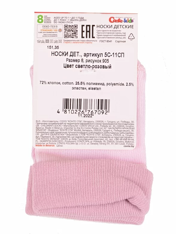 Круглогодичные укороченные детские носки, цвет розовый, прикольные, состав: 72% хлопок, 25.5% полиамид, 2.5% эластан, фабричный артикул 5С-11СП. Производитель «Conte, Беларусь» под брендом «Conte».