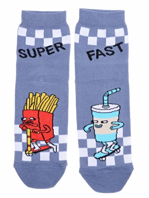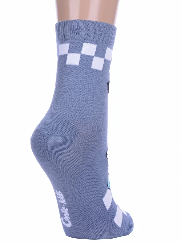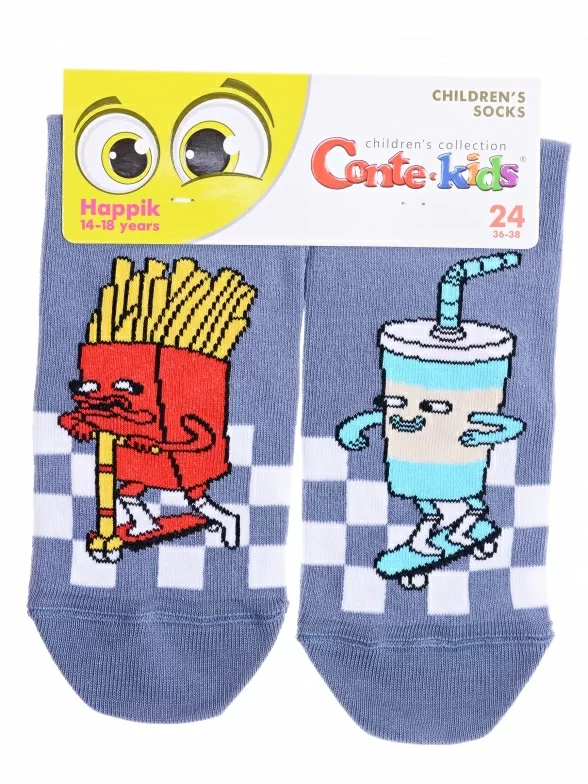 Круглогодичные укороченные детские носки, цвет темно-серый, повседневные, шов кеттельный (бесшовная технология), принт (рисунок): надписи, клетка, еда и напитки, с узором, состав: 72% хлопок, 25.5% полиамид, 2.5% эластан, арт. 17С-10СП. Производитель «Conte, Беларусь» под брендом «Conte».