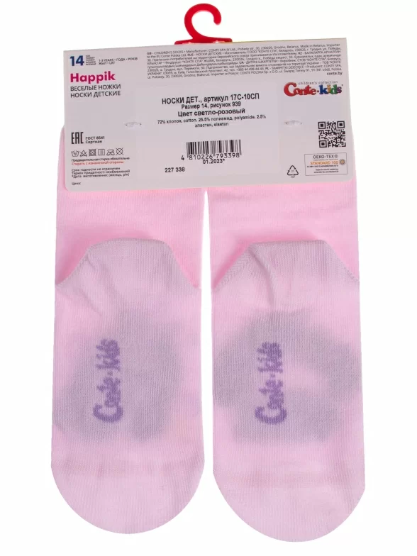 Круглогодичные укороченные детские носки, цвет розовый, прикольные, состав: 72% хлопок, 25.5% полиамид, 2.5% эластан, фабричный артикул 17С-10СП. Производитель «Conte, Беларусь» под брендом «Conte».