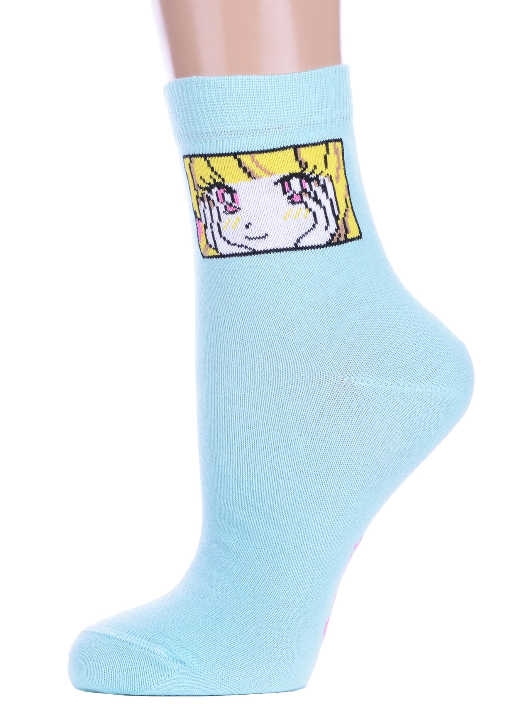 Круглогодичные укороченные детские носки, цвет бирюзовый, повседневные, шов кеттельный (бесшовная технология), принт (рисунок): люди, с узором, состав: 72% хлопок, 25.5% полиамид, 2.5% эластан, арт. 17С-10СП. Производитель «Conte, Беларусь» под брендом «Conte».