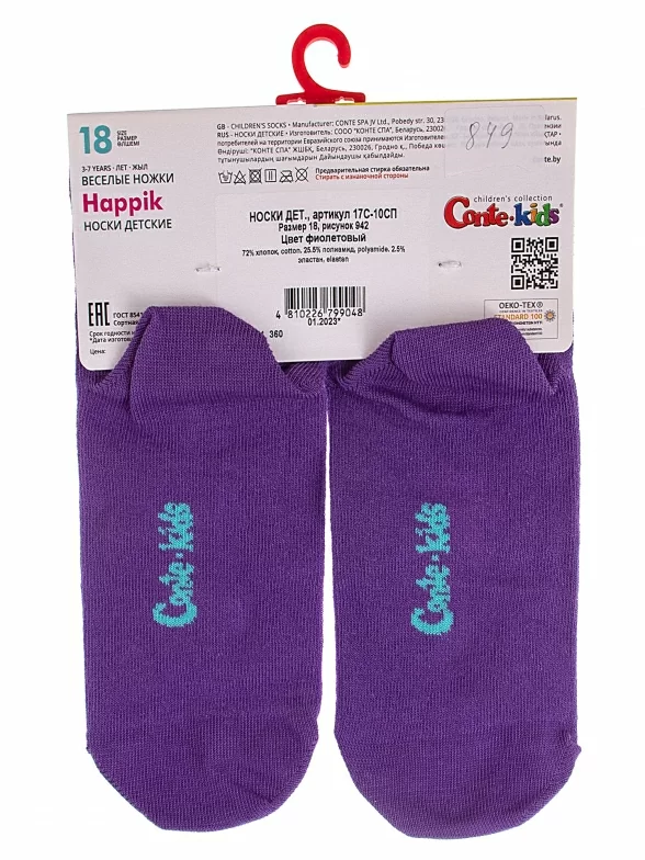 Круглогодичные укороченные детские носки, цвет фиолетовый, прикольные, состав: 72% хлопок, 25.5% полиамид, 2.5% эластан, фабричный артикул 17С-10СП. Производитель «Conte, Беларусь» под брендом «Conte».