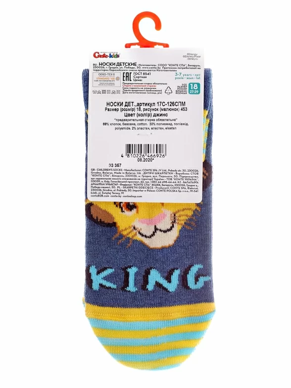 Круглогодичные укороченные детские носки, цвет джинс, прикольные, состав: 68% хлопок, 30% полиамид, 2% эластан, фабричный артикул 17С-126СПМ. Производитель «Conte, Беларусь» под брендом «Conte».