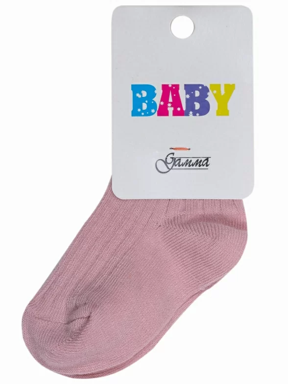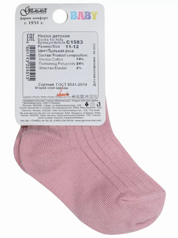 Круглогодичные укороченные детские носки, цвет розовый, классические, шов обычный (не бесшовные), принт (рисунок): в рубчик, однотонный, состав: 74% хлопок, 24% полиамид, 2% эластан, арт. С1583. Производитель «ГАММА» Россия под брендом «Гамма».