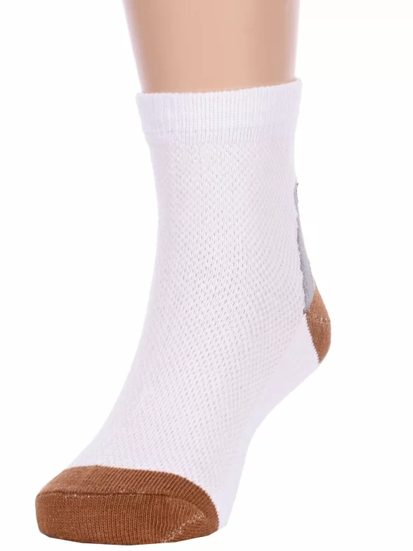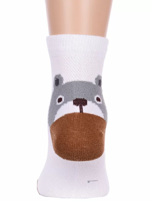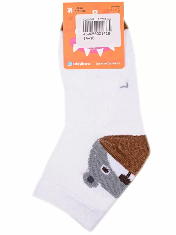 Летние укороченные детские носки, цвет серый-белый, повседневные, в сеточку, шов обычный (не бесшовные), принт (рисунок): контрастные пятка / мысок / резинка, животные, с узором, состав: 75% хлопок, 23% полиамид, 2% эластан, арт. Ндх3567. Производитель «Китай, страна бренда - Россия» под брендом «Hobby line».