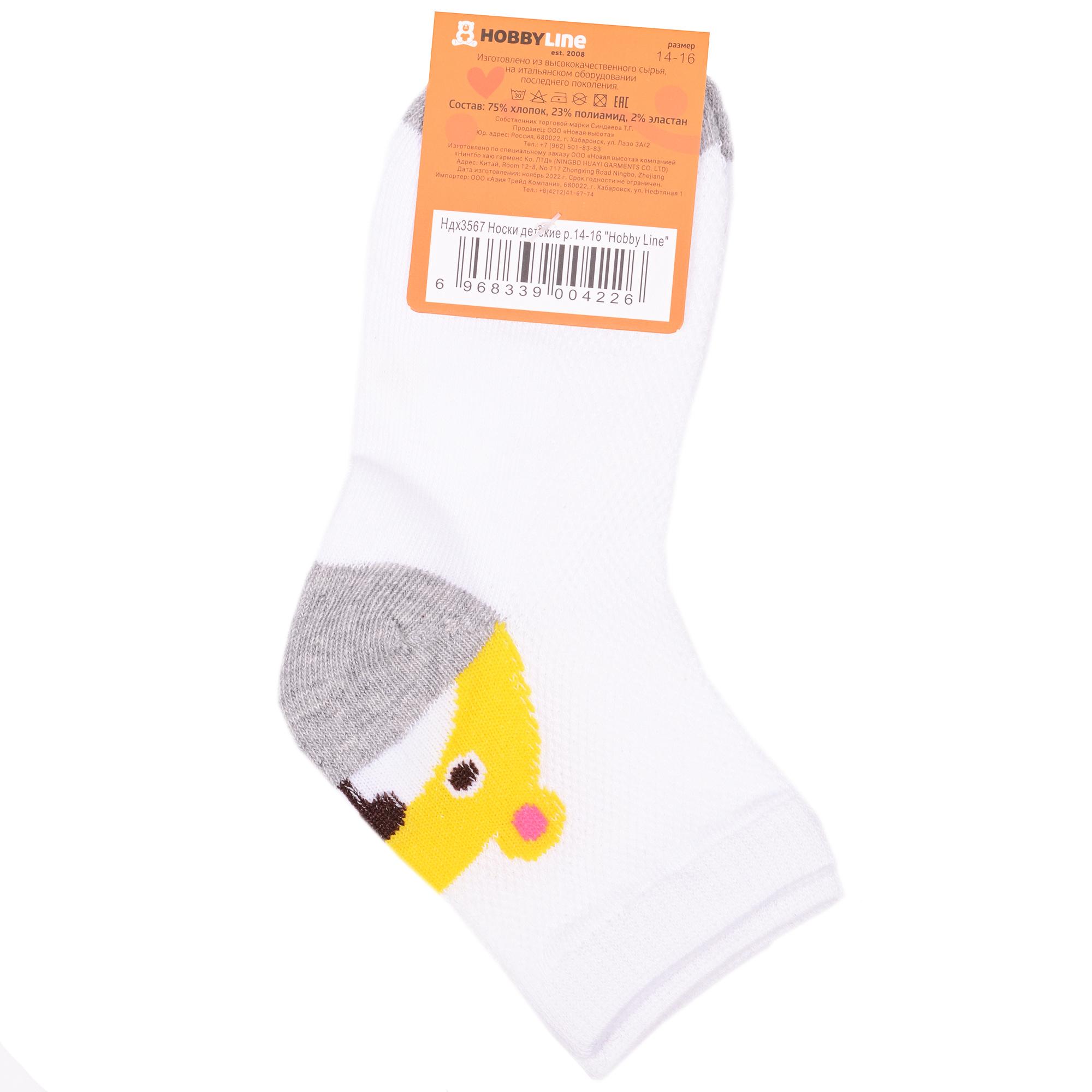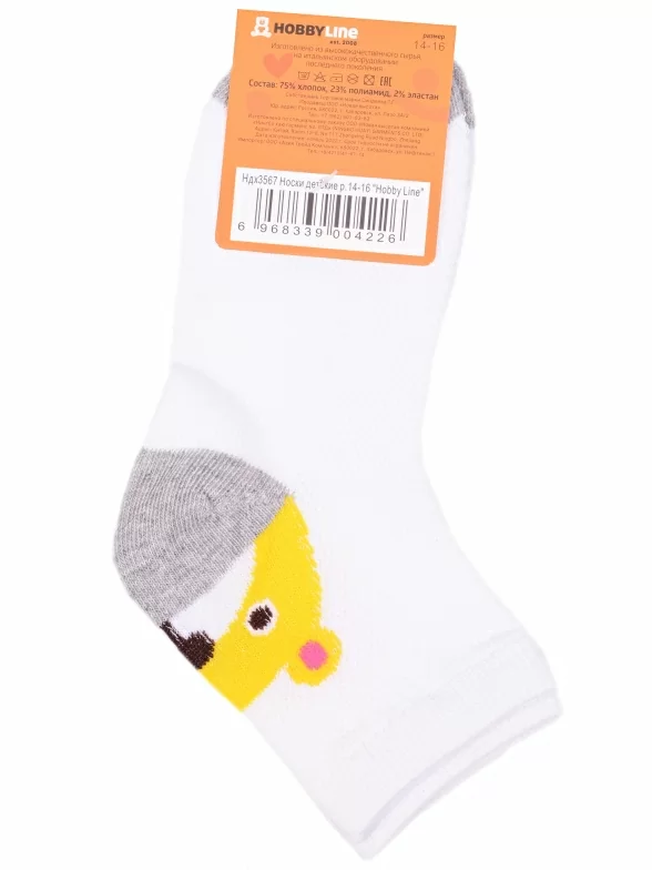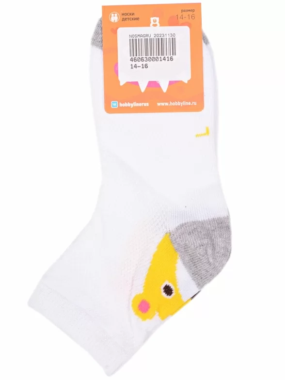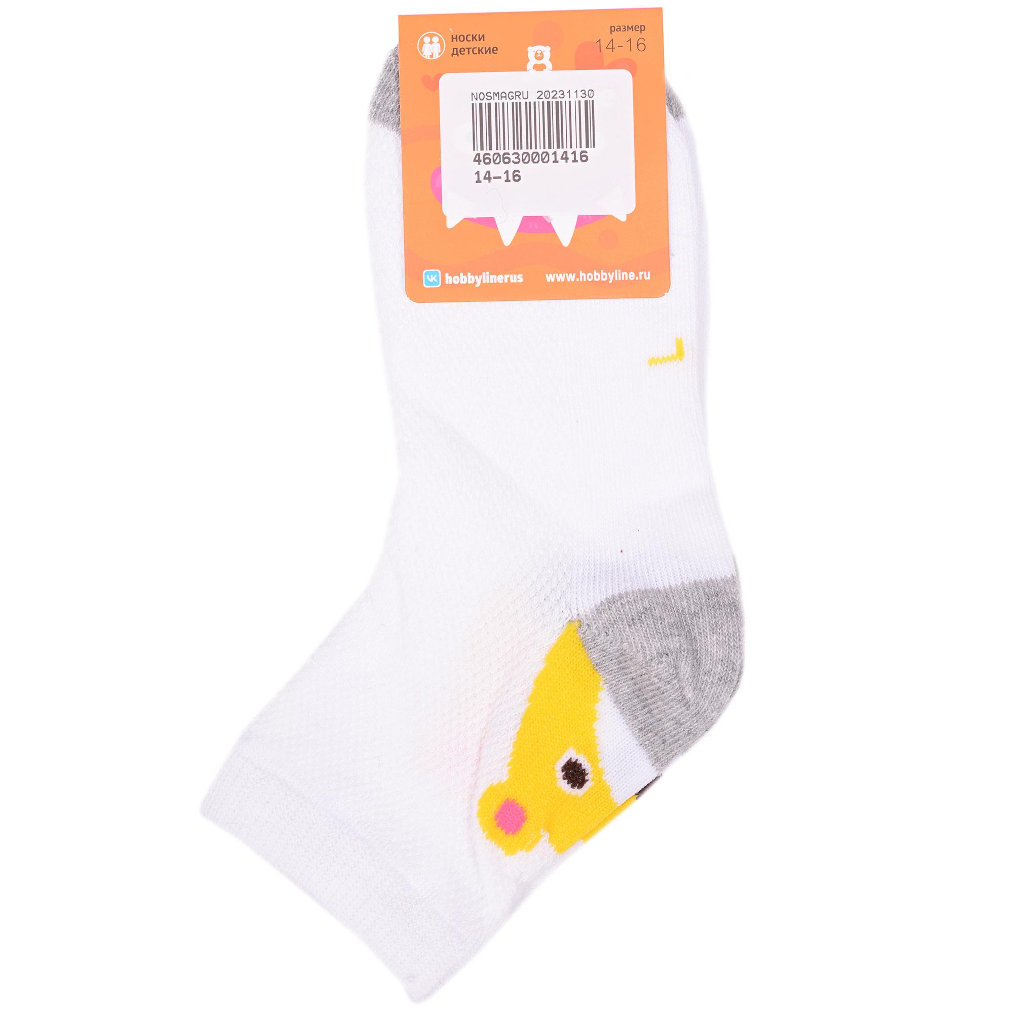 Летние укороченные детские носки, цвет желтый-белый, повседневные, в сеточку, шов обычный (не бесшовные), принт (рисунок): контрастные пятка / мысок / резинка, животные, с узором, состав: 75% хлопок, 23% полиамид, 2% эластан, арт. Ндх3567. Производитель «Китай, страна бренда - Россия» под брендом «Hobby line».