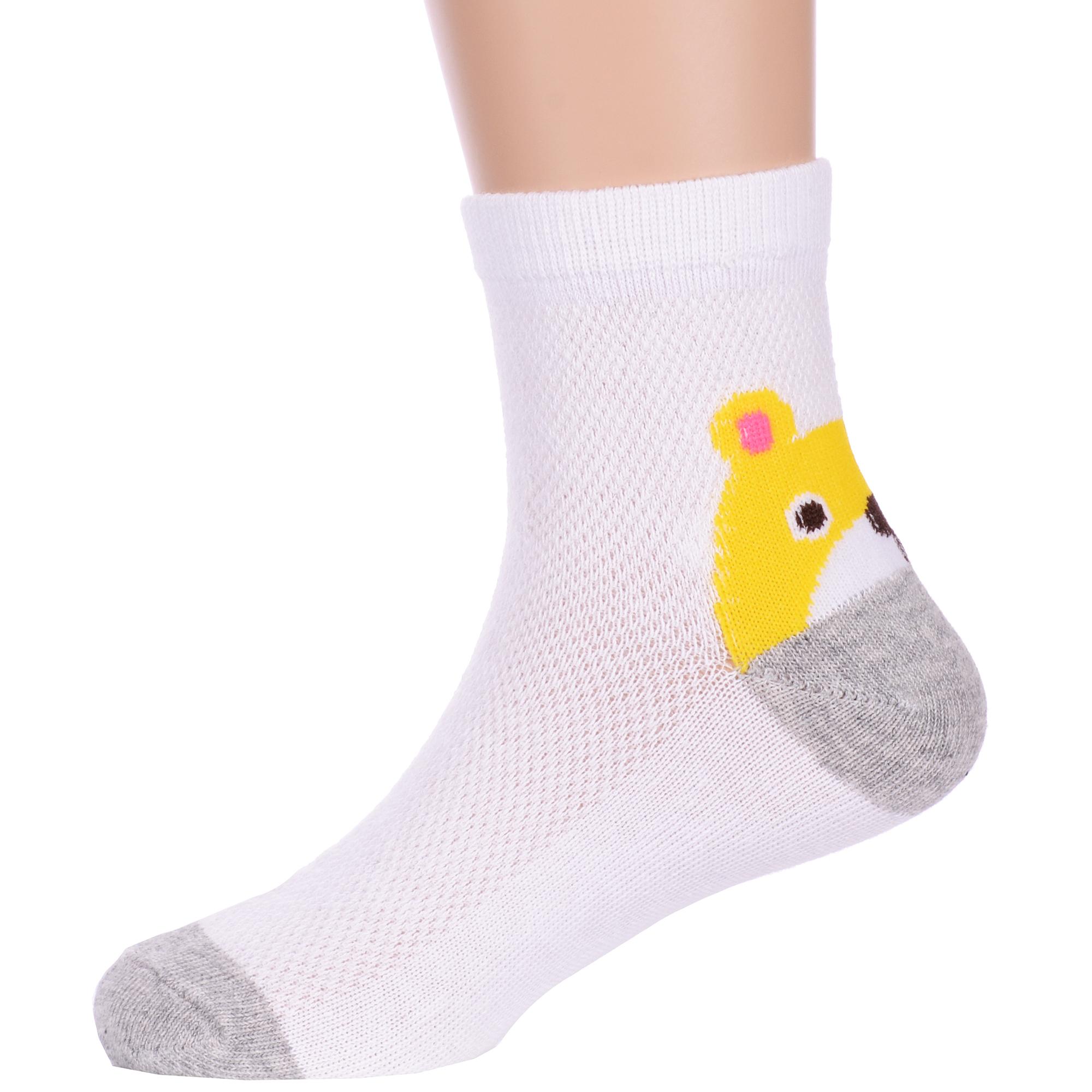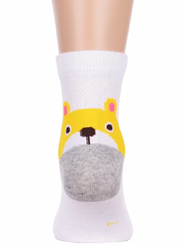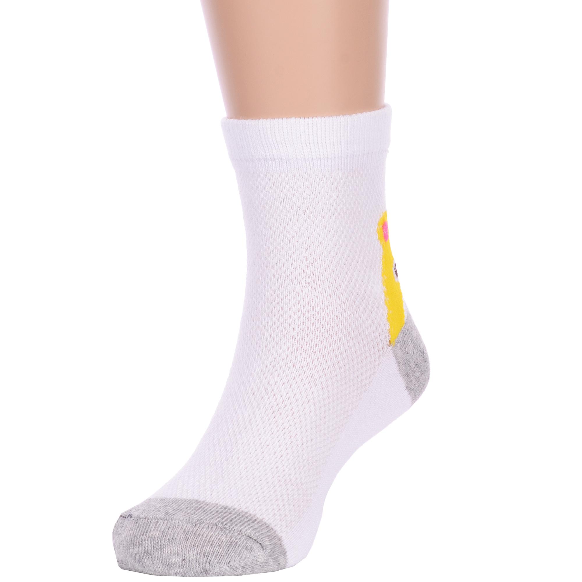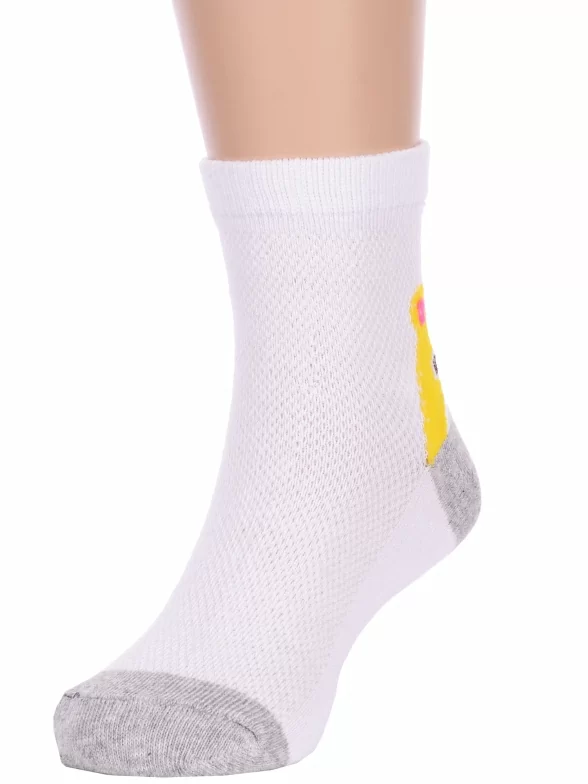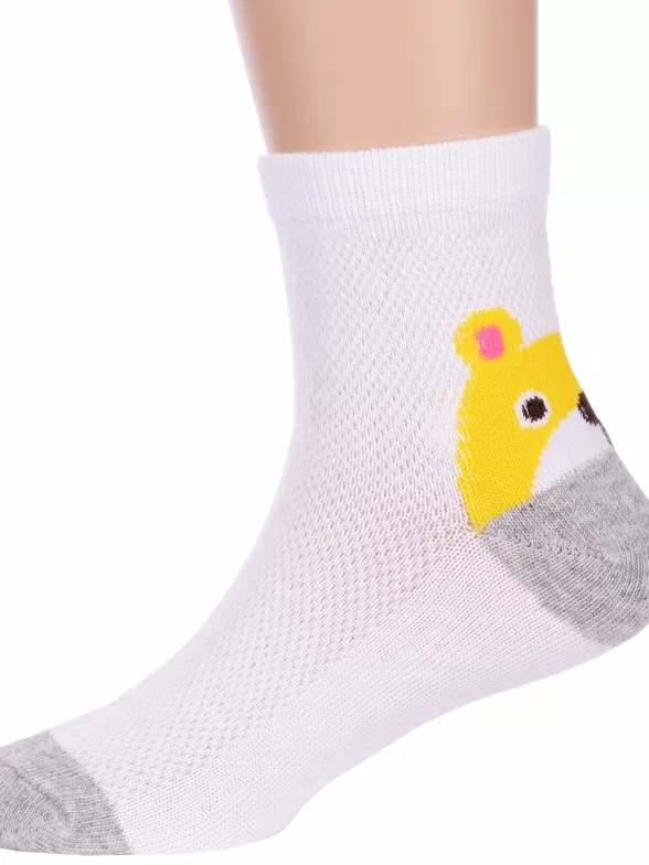 Летние укороченные детские носки, цвет желтый-белый, повседневные, в сеточку, шов обычный (не бесшовные), принт (рисунок): контрастные пятка / мысок / резинка, животные, с узором, состав: 75% хлопок, 23% полиамид, 2% эластан, арт. Ндх3567. Производитель «Китай, страна бренда - Россия» под брендом «Hobby line».