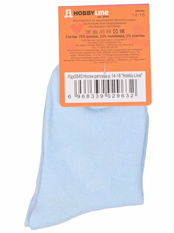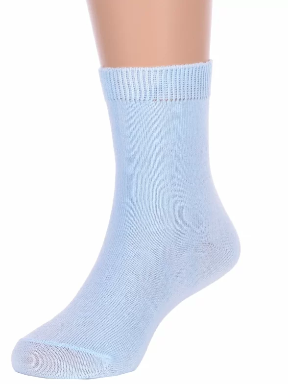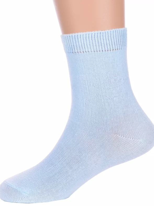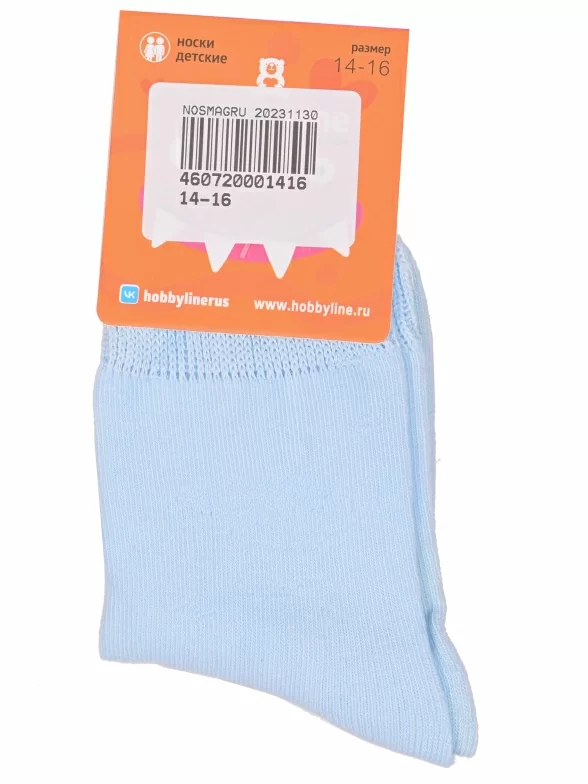Круглогодичные укороченные детские носки, цвет голубой, классические, шов обычный (не бесшовные), принт (рисунок): однотонный, без рисунков/узоров, состав: 75% хлопок, 23% полиамид, 2% эластан, арт. Ндх3540. Производитель «Китай, страна бренда - Россия» под брендом «Hobby line».