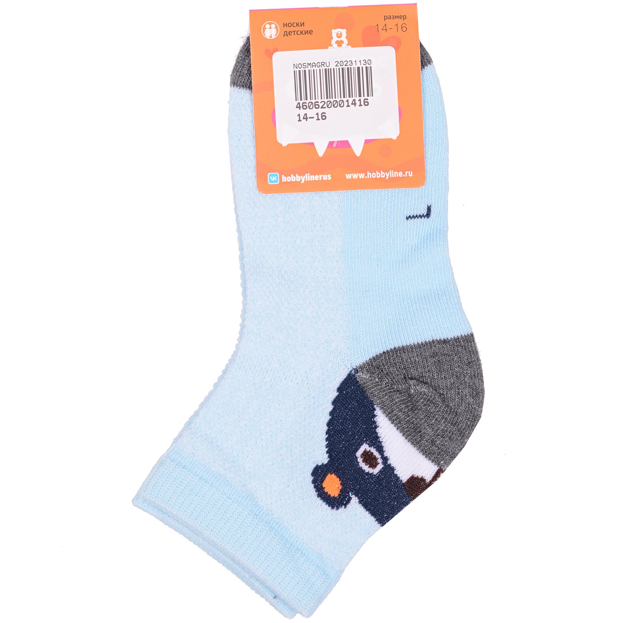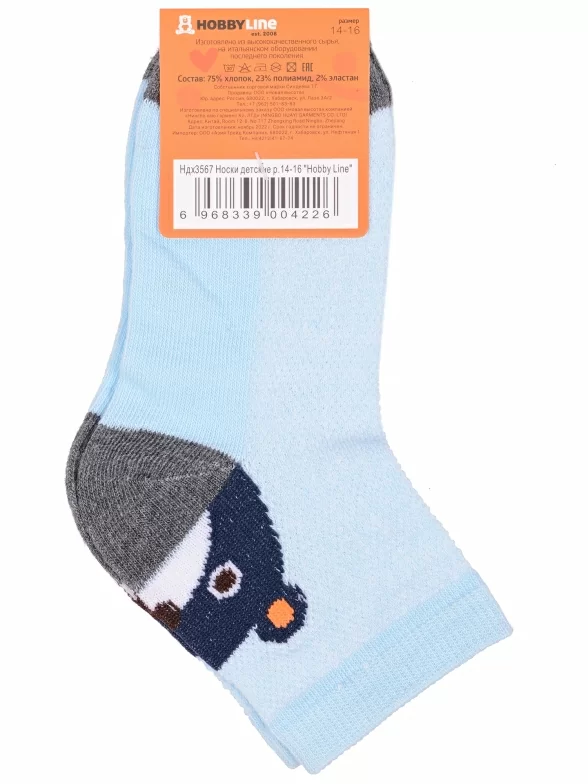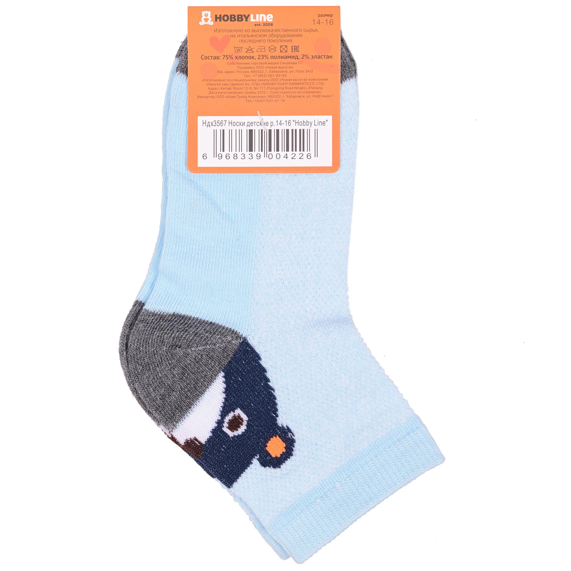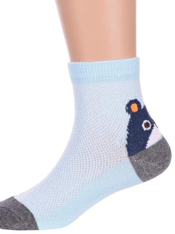 Летние укороченные детские носки, цвет голубой, повседневные, в сеточку, шов обычный (не бесшовные), принт (рисунок): контрастные пятка / мысок / резинка, животные, с узором, состав: 75% хлопок, 23% полиамид, 2% эластан, арт. Ндх3567. Производитель «Китай, страна бренда - Россия» под брендом «Hobby line».