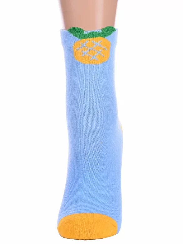 Круглогодичные укороченные детские носки, цвет голубой, повседневные, шов обычный (не бесшовные), принт (рисунок): овощи / фрукты / ягоды, контрастные пятка / мысок / резинка, с узором, состав: 75% хлопок, 23% полиамид, 2% эластан, арт. Ндх3592-06. Производитель «Китай, страна бренда - Россия» под брендом «Hobby line».