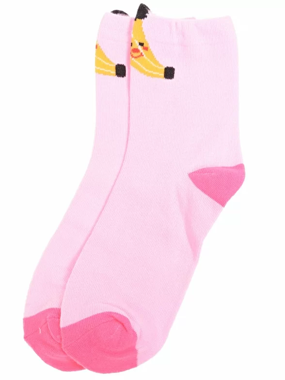 Круглогодичные укороченные детские носки, цвет розовый, повседневные, шов обычный (не бесшовные), принт (рисунок): овощи / фрукты / ягоды, контрастные пятка / мысок / резинка, еда и напитки, с узором, состав: 75% хлопок, 23% полиамид, 2% эластан, арт. Ндх3592-06. Производитель «Китай, страна бренда - Россия» под брендом «Hobby line».