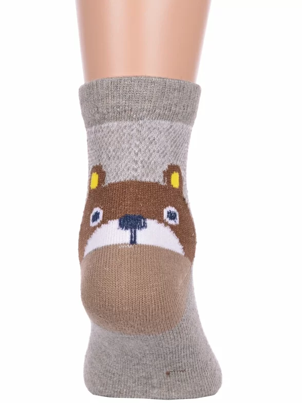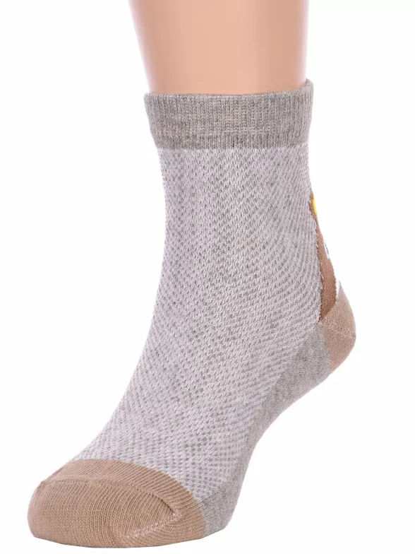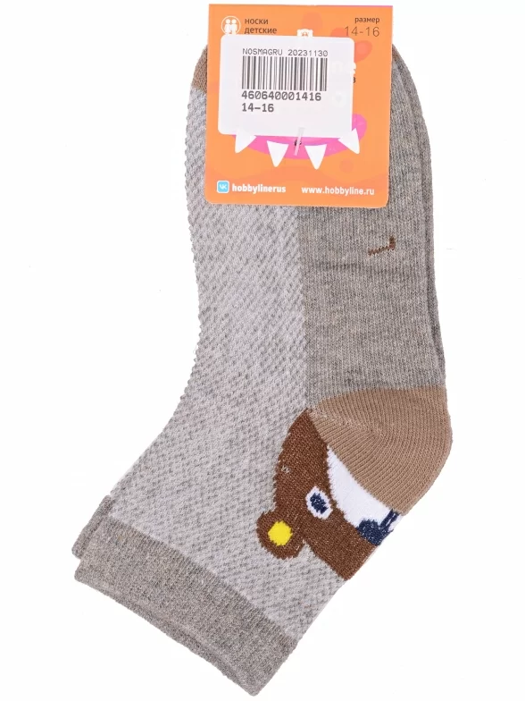 Летние укороченные детские носки, цвет серый, повседневные, в сеточку, шов обычный (не бесшовные), принт (рисунок): контрастные пятка / мысок / резинка, животные, с узором, состав: 75% хлопок, 23% полиамид, 2% эластан, арт. Ндх3567. Производитель «Китай, страна бренда - Россия» под брендом «Hobby line».