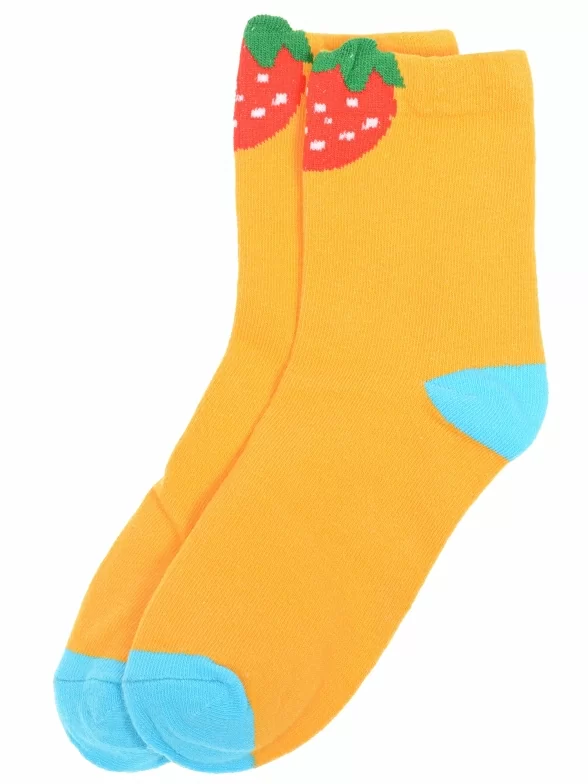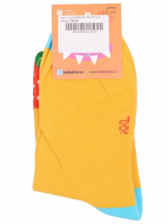 Круглогодичные укороченные детские носки, цвет желтый, повседневные, шов обычный (не бесшовные), принт (рисунок): овощи / фрукты / ягоды, контрастные пятка / мысок / резинка, еда и напитки, с узором, состав: 75% хлопок, 23% полиамид, 2% эластан, арт. Ндх3592-06. Производитель «Китай, страна бренда - Россия» под брендом «Hobby line».