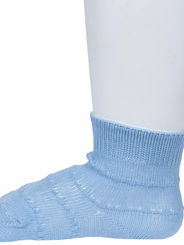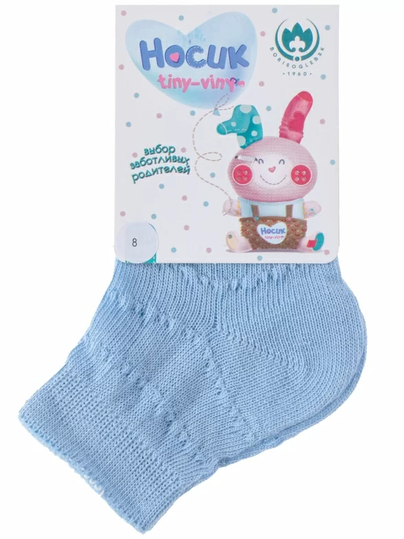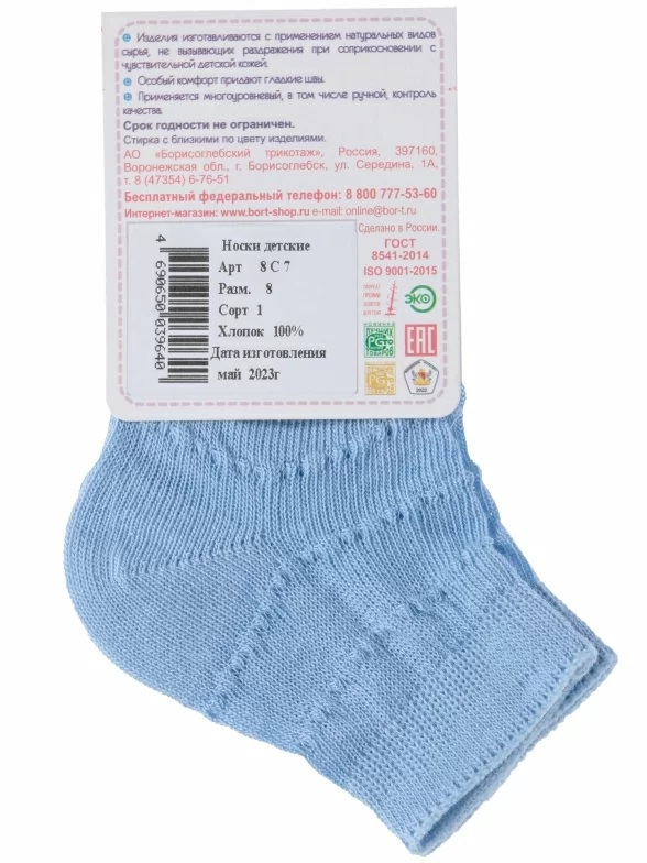 Летние средней длины детские носки, цвет голубой, классические, шов обычный (не бесшовные), принт (рисунок): кружево (или имитация), однотонный, состав: 100% хлопок, арт. 8С7. Производитель «АО Борисоглебский трикотаж, Воронежская обл, Россия» под брендом «Борисоглебский трикотаж».