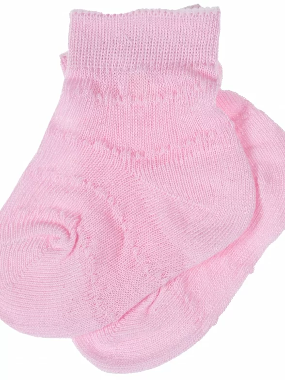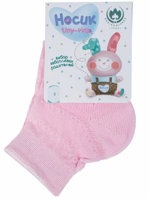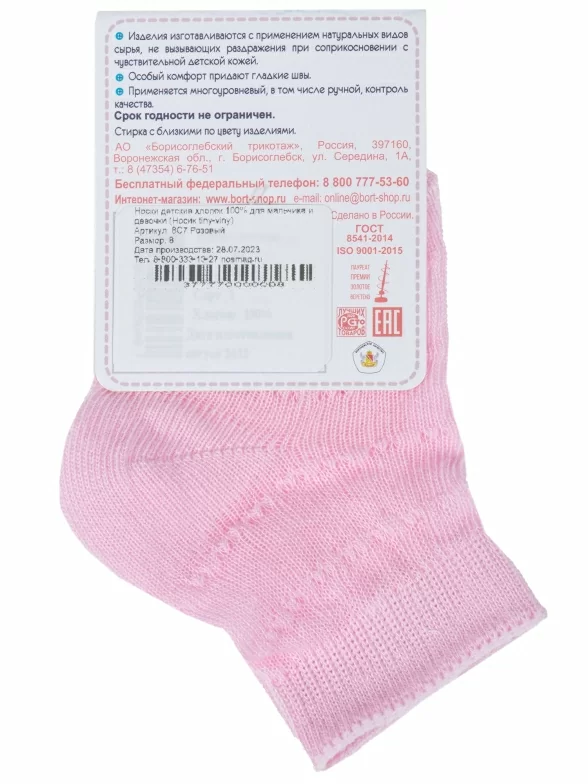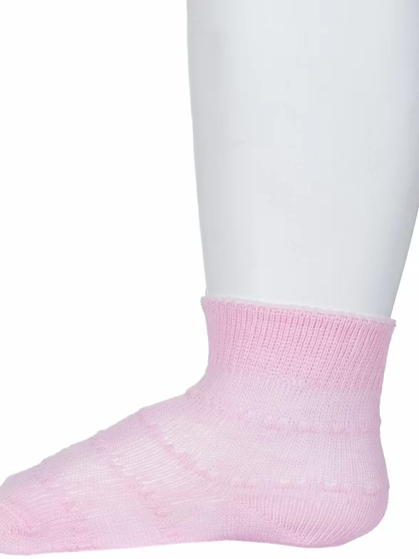 Летние укороченные детские носки, цвет розовый, ажурные, классические, шов обычный (не бесшовные), принт (рисунок): однотонный, без рисунков/узоров, состав: 100% хлопок, арт. 8С7. Производитель «АО Борисоглебский трикотаж, Воронежская обл, Россия» под брендом «Борисоглебский трикотаж».
