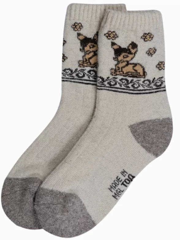 Модель чуть укороченной длины с двойным бортом (манжетом резинки), с ощутимым уплотнением в месте шва на мыске; украшена милым рисунком, изображающим олененка, на стопе вывязан размер носков.