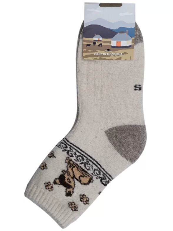 Изготовлены в Монголии из 100% шерсти, что делает изделие износостойким, теплым и гигроскопичным (способным впитывать влагу). Кроме того, такие носки устойчивы к загрязнению, сохраняют форму и цвет, а благодаря умеренному покалыванию, осуществляется легкий микро-массаж стоп, что дополнительно согревает, усиливая кровообращение в ногах.