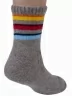 Модель чуть укороченной длины с двойным бортом (манжетом резинки), с ощутимым уплотнением в месте шва на мыске; оформлена контрастными яркими полосками на паголенке, на стопе вывязан размер носков.