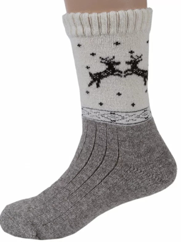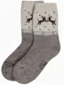 Модель чуть укороченной длины с двойным бортом (манжетом резинки), с ощутимым уплотнением в месте шва на мыске; светлый паголенок украшен орнаментом и изображениями оленей, на стопе вывязан размер носков.