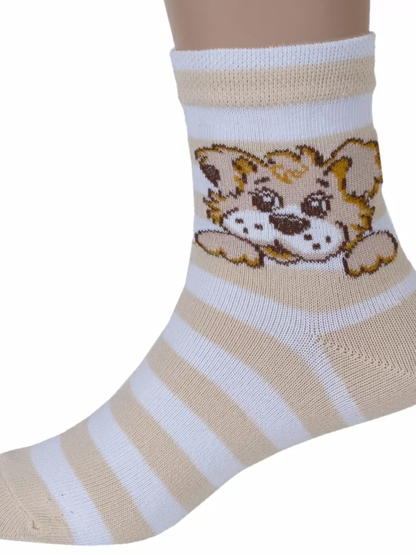 Детские носки с полосками и изображением собачки. Связаны на российской фабрике "Красная ветка" (Иваново). На 72% состоят из хлопка, что позволяет коже дышать целый день. Полиамид и эластан делают изделие более плотным, износостойким и хорошо тянущимся.