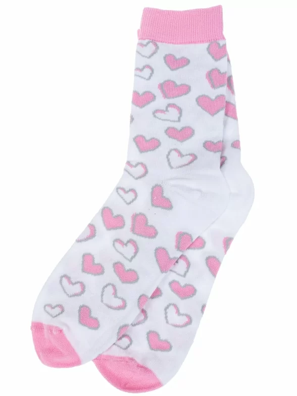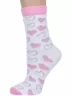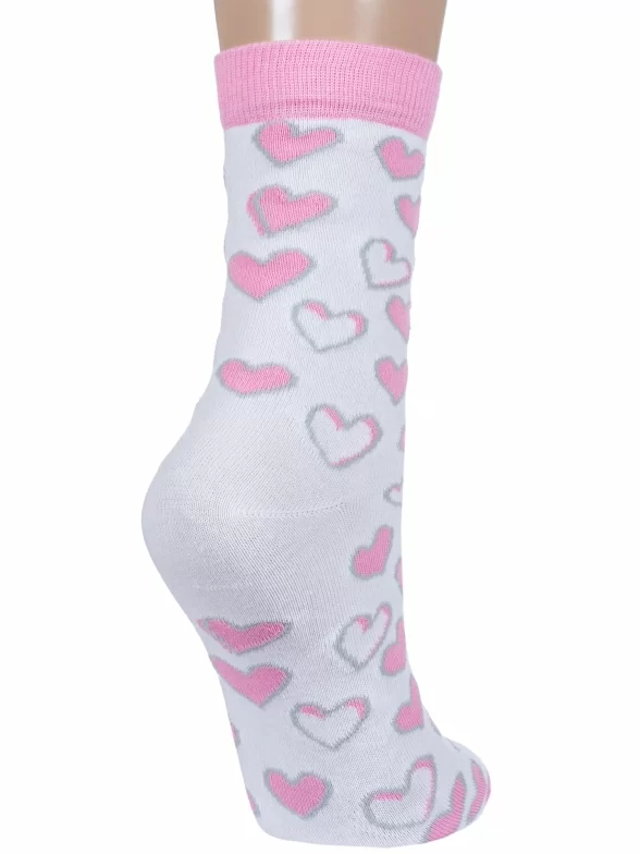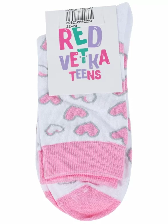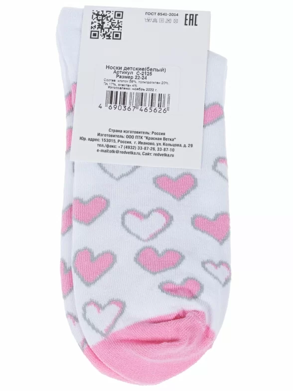 Круглогодичные укороченные детские носки, цвет белый, повседневные, возможно бесшовные, принт (рисунок): сердечки / поцелуи / любовь, контрастные пятка / мысок / резинка, с узором, состав: 59% хлопок, 20% полипропилен, 17% полиамид, 4% эластан, арт. С-2125. Производитель «КРАСНАЯ ВЕТКА» Россия под брендом «Красная ветка».