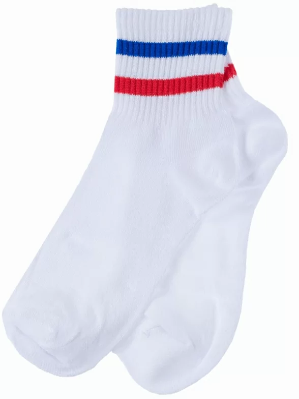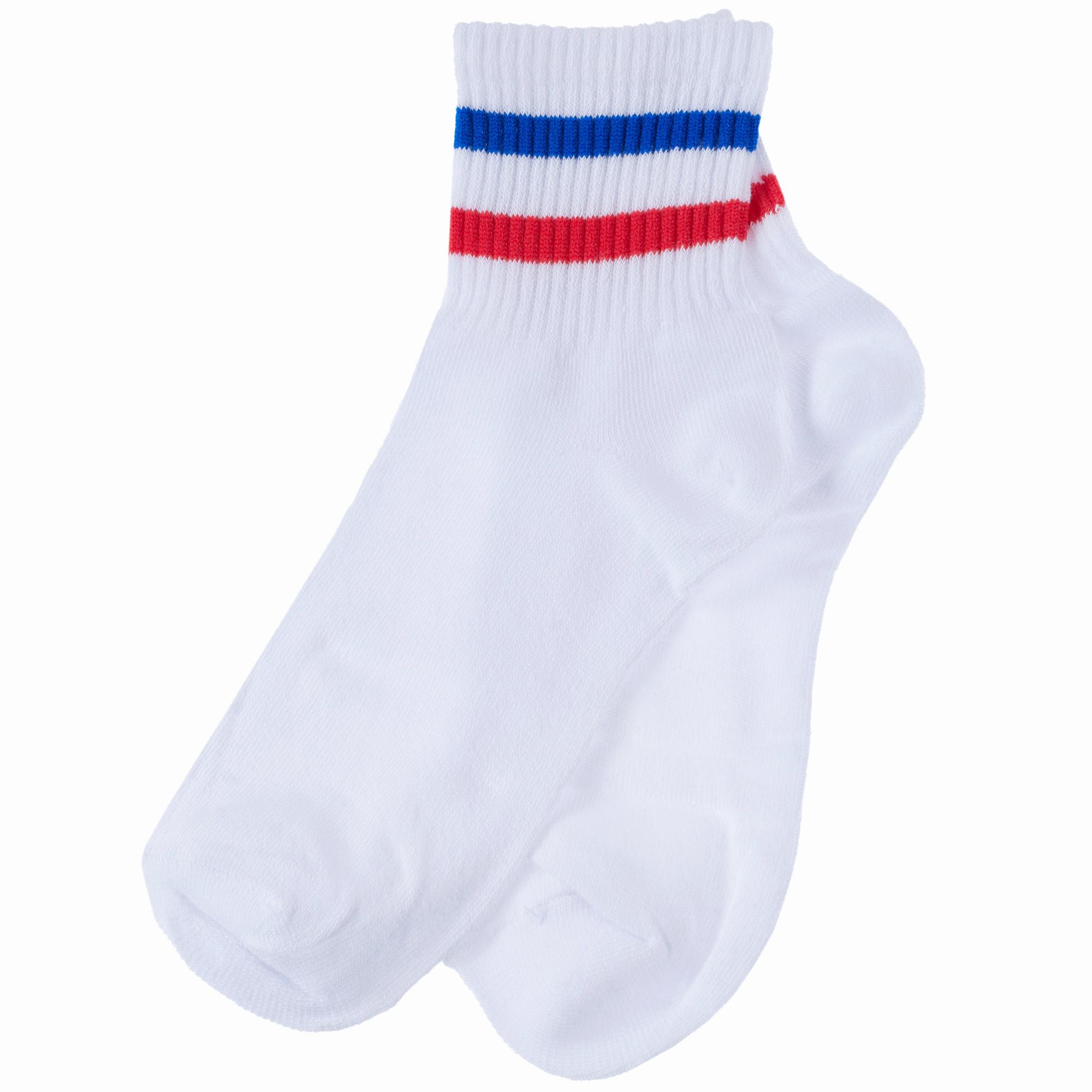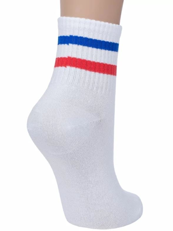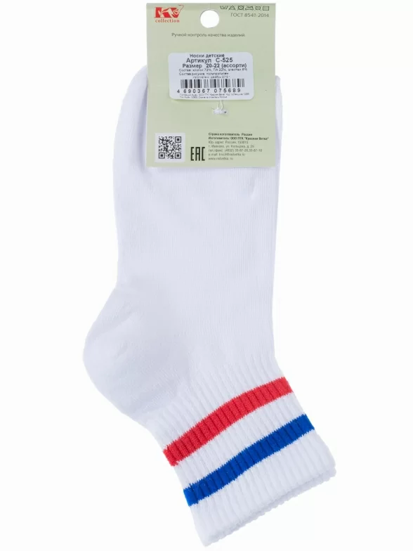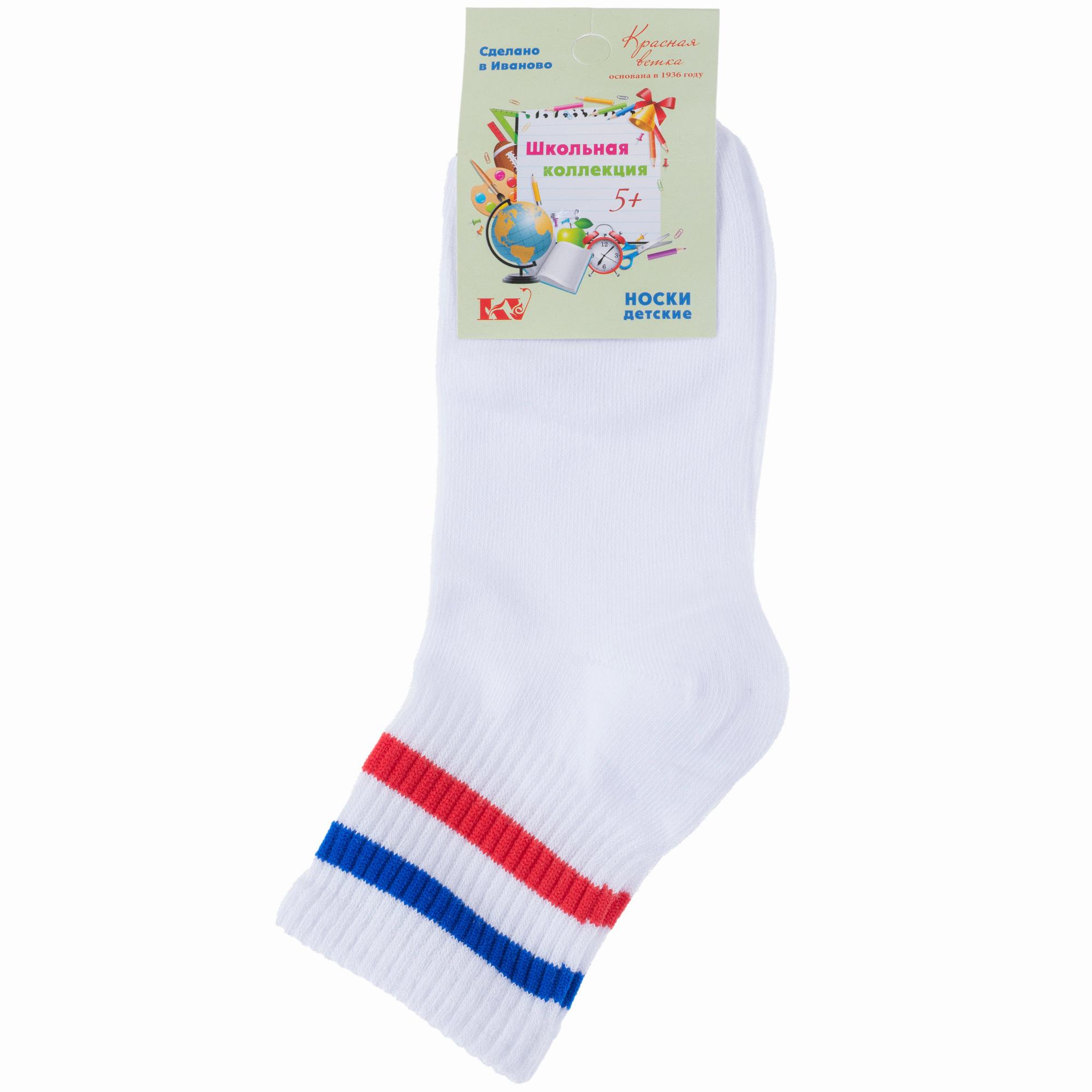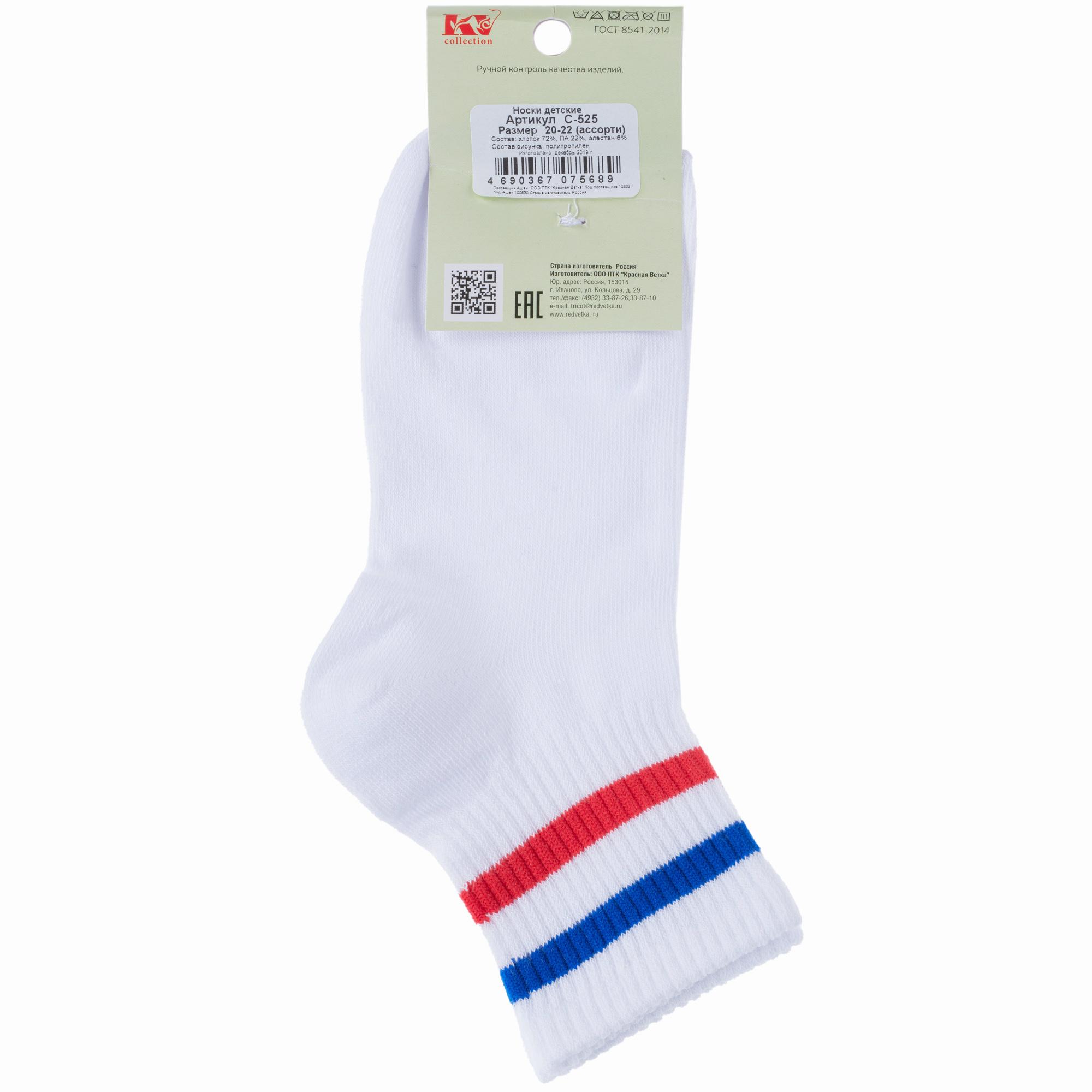 Круглогодичные укороченные детские носки, цвет белый, спортивные, шов обычный (не бесшовные), принт (рисунок): спортивные, полоски, в рубчик, с узором, состав: 72% хлопок, 22% полиамид, 6% эластан, арт. С-525. Производитель «КРАСНАЯ ВЕТКА» Россия под брендом «Красная ветка».