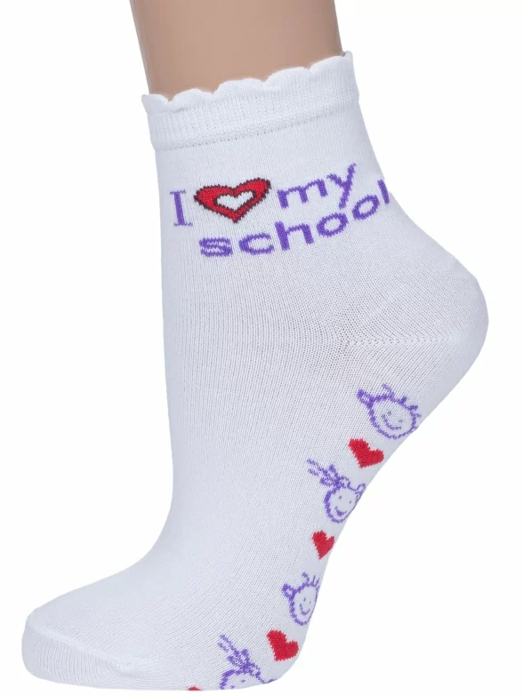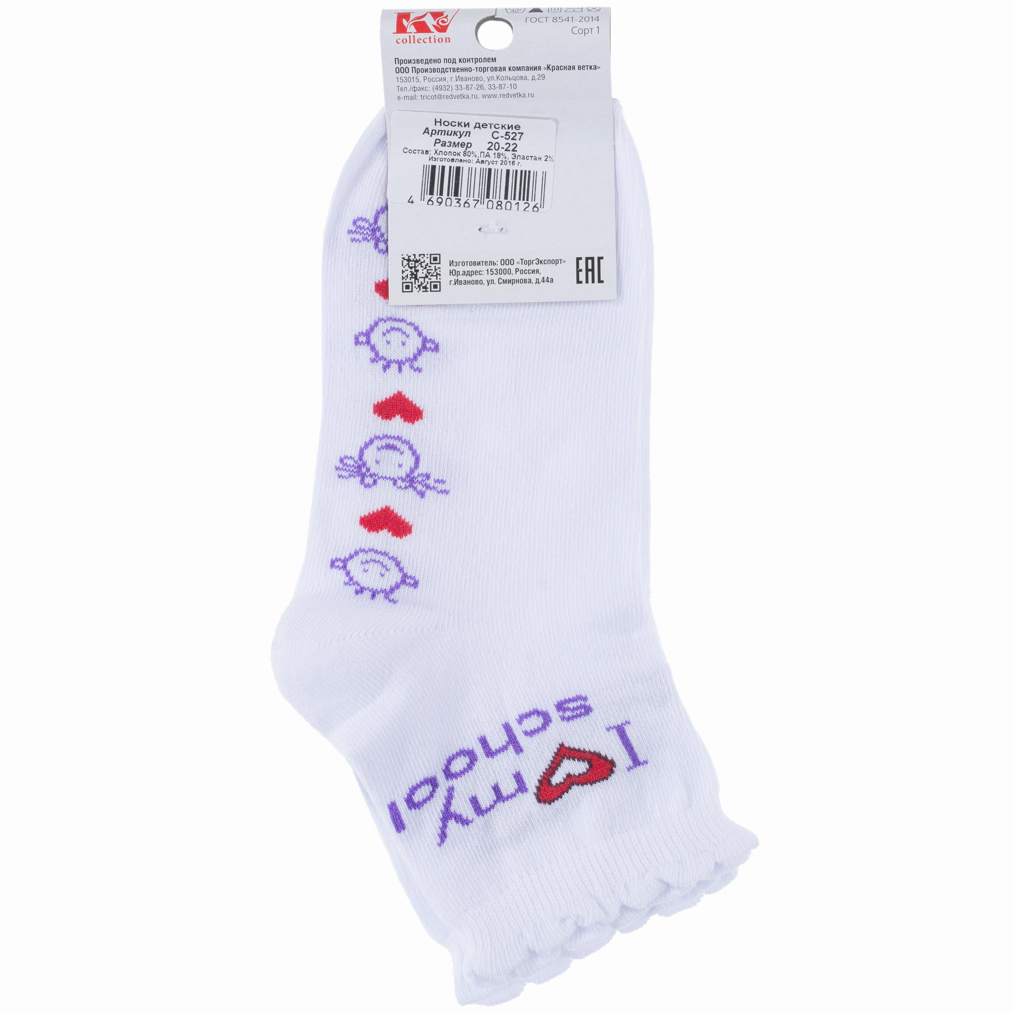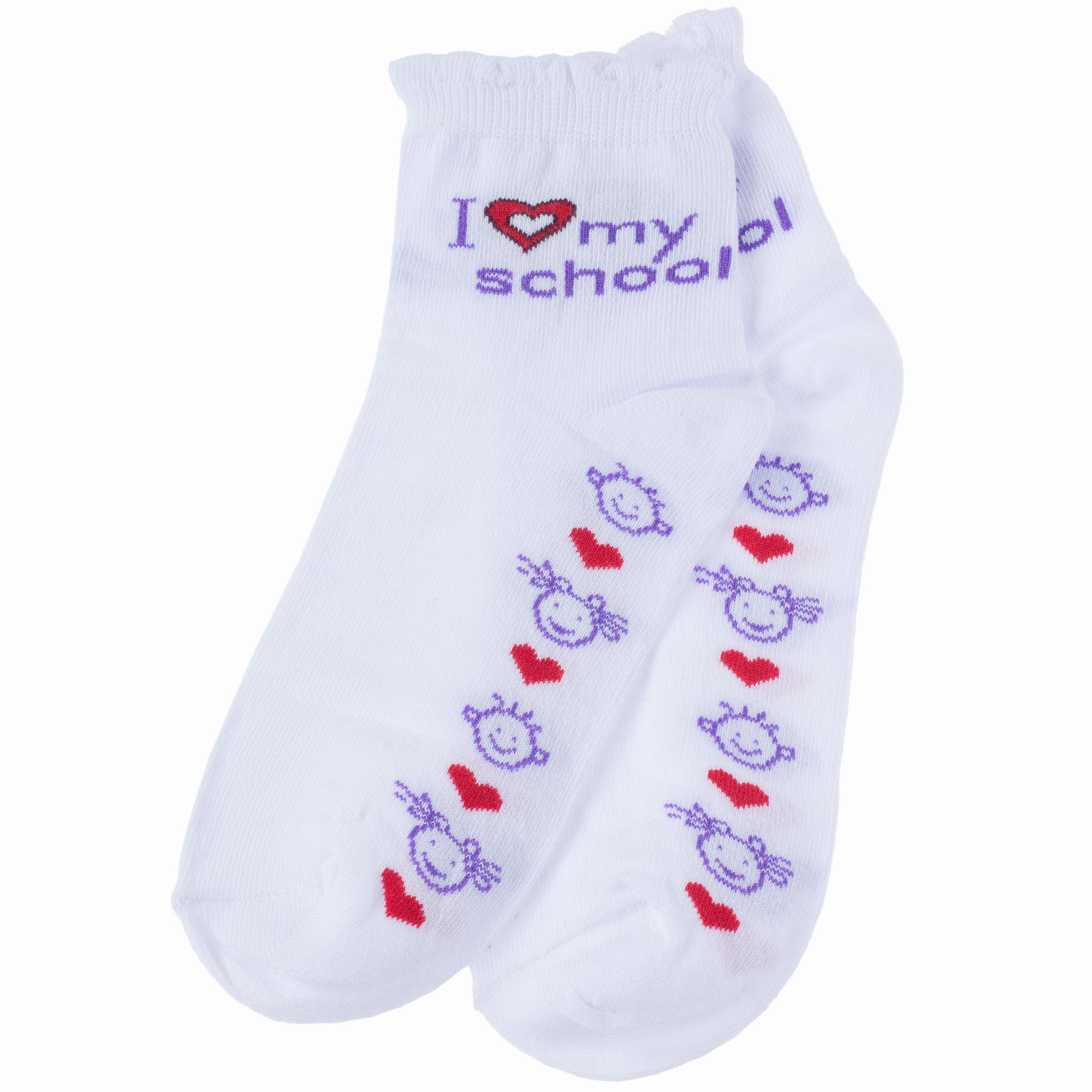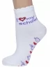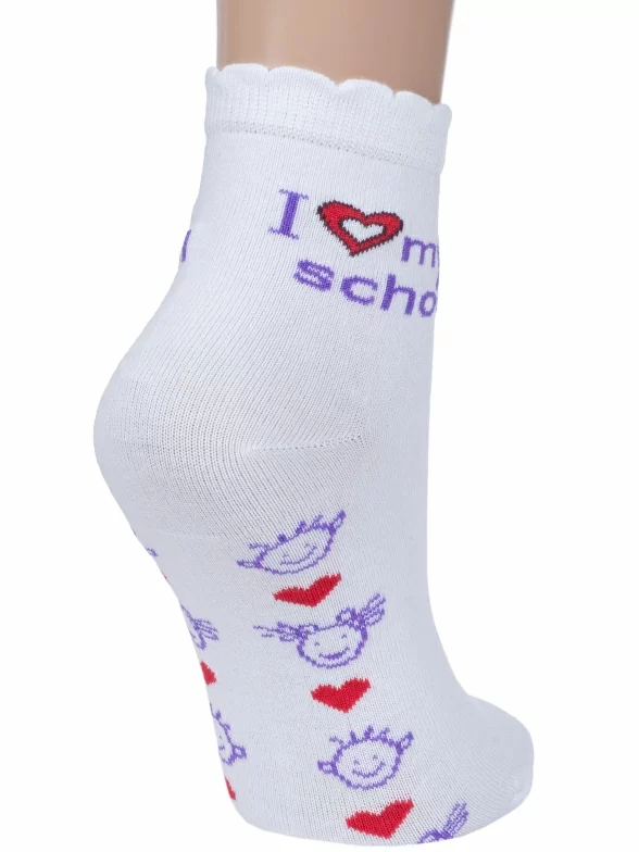 Круглогодичные укороченные детские носки, цвет белый, повседневные, шов обычный (не бесшовные), принт (рисунок): учеба, сердечки / поцелуи / любовь, надписи, с узором, состав: 80% хлопок, 18% полиамид, 2% эластан, арт. С-527. Производитель «КРАСНАЯ ВЕТКА» Россия под брендом «Красная ветка».