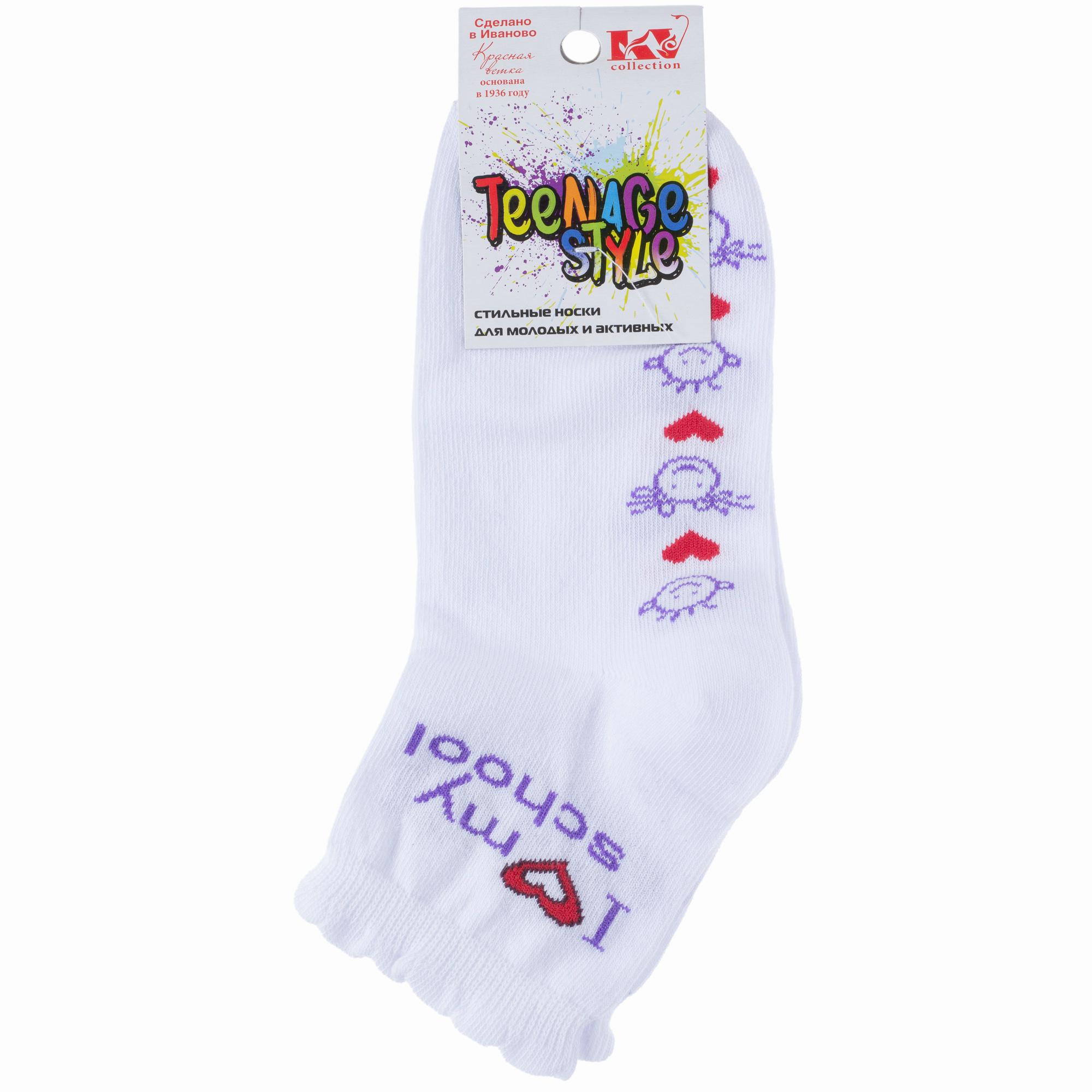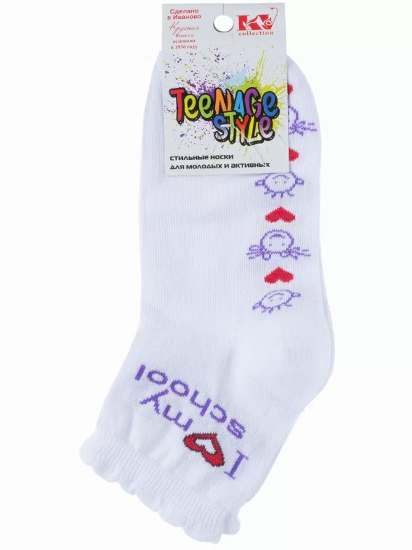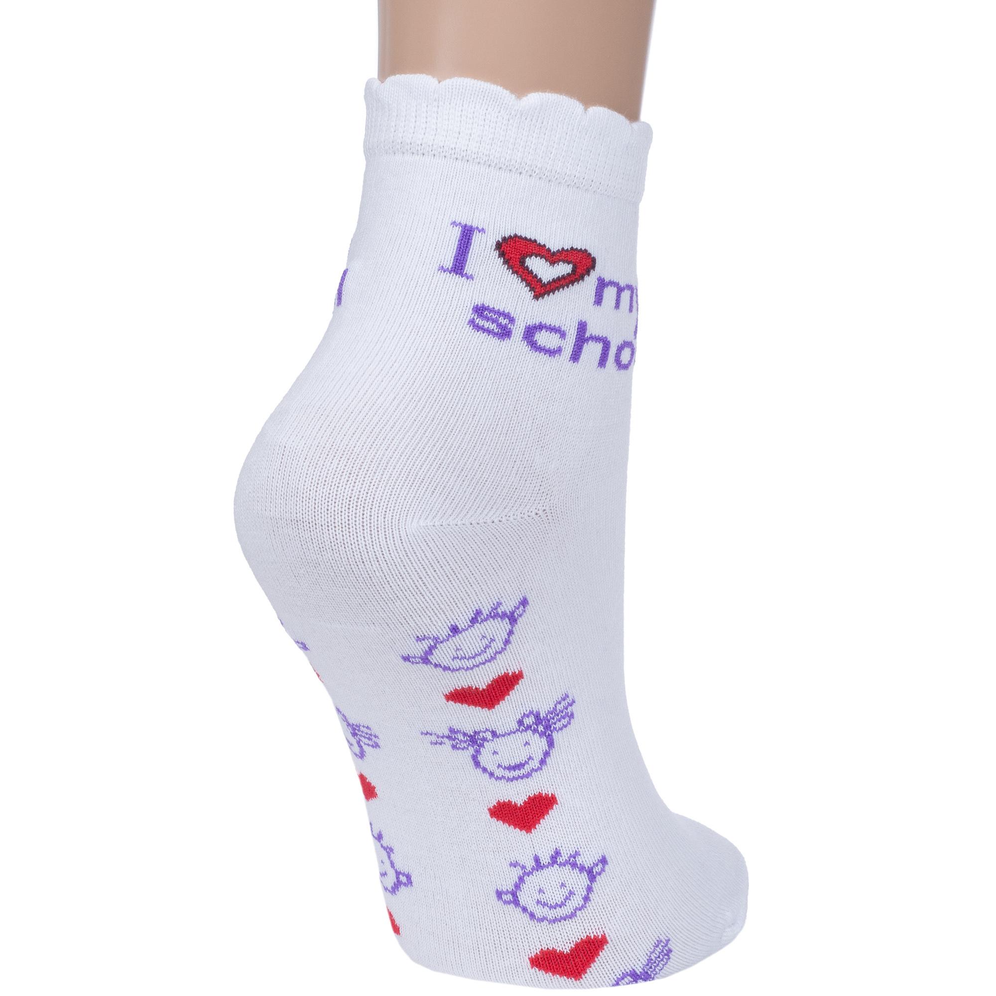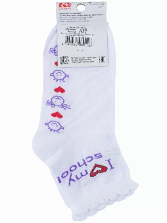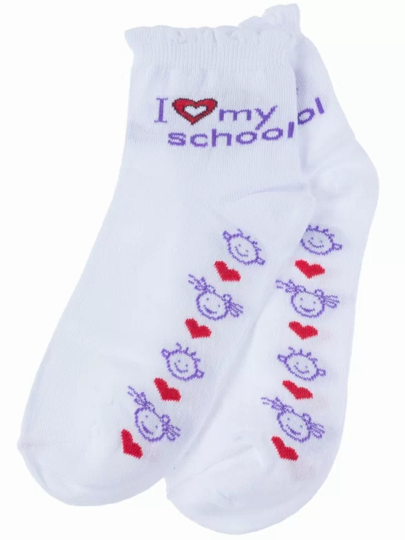 Круглогодичные укороченные детские носки, цвет белый, повседневные, шов обычный (не бесшовные), принт (рисунок): учеба, сердечки / поцелуи / любовь, надписи, с узором, состав: 80% хлопок, 18% полиамид, 2% эластан, арт. С-527. Производитель «КРАСНАЯ ВЕТКА» Россия под брендом «Красная ветка».