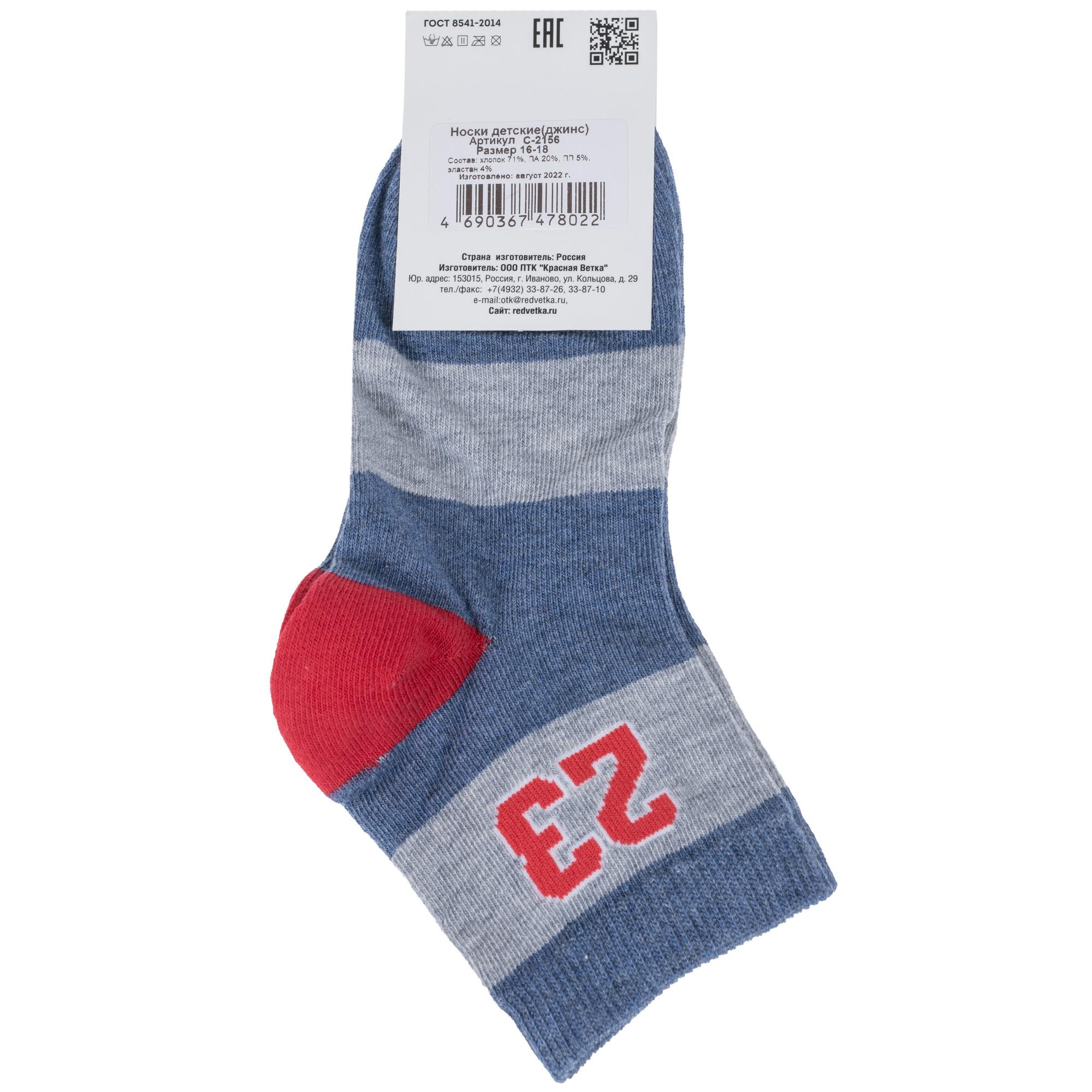 Круглогодичные укороченные детские носки, цвет джинс, повседневные, возможно бесшовные, принт (рисунок): полоски, надписи, контрастные пятка / мысок / резинка, с узором, состав: 71% хлопок, 20% полиамид, 5% полипропилен, 4% эластан, арт. С-2156. Производитель «КРАСНАЯ ВЕТКА» Россия под брендом «Красная ветка».