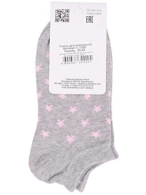 Межсезонные или летние ультракороткие детские носки, цвет серый, классические, состав: 78% хлопок, 18% ПА, 4% эластан, фабричный артикул С-1706. Производитель «КРАСНАЯ ВЕТКА» Россия под брендом «Красная ветка».
