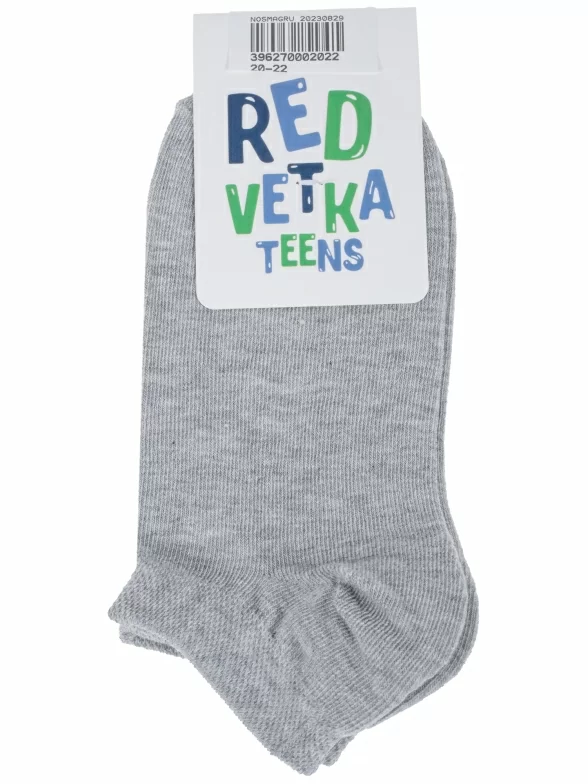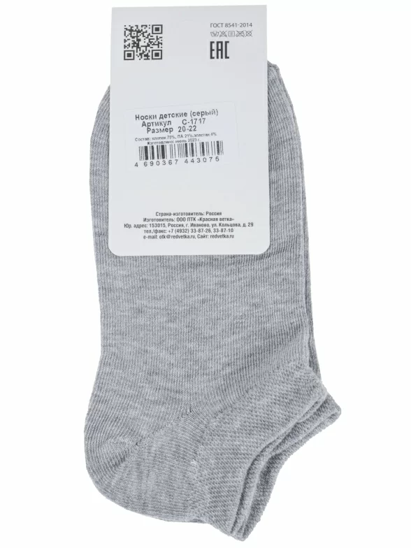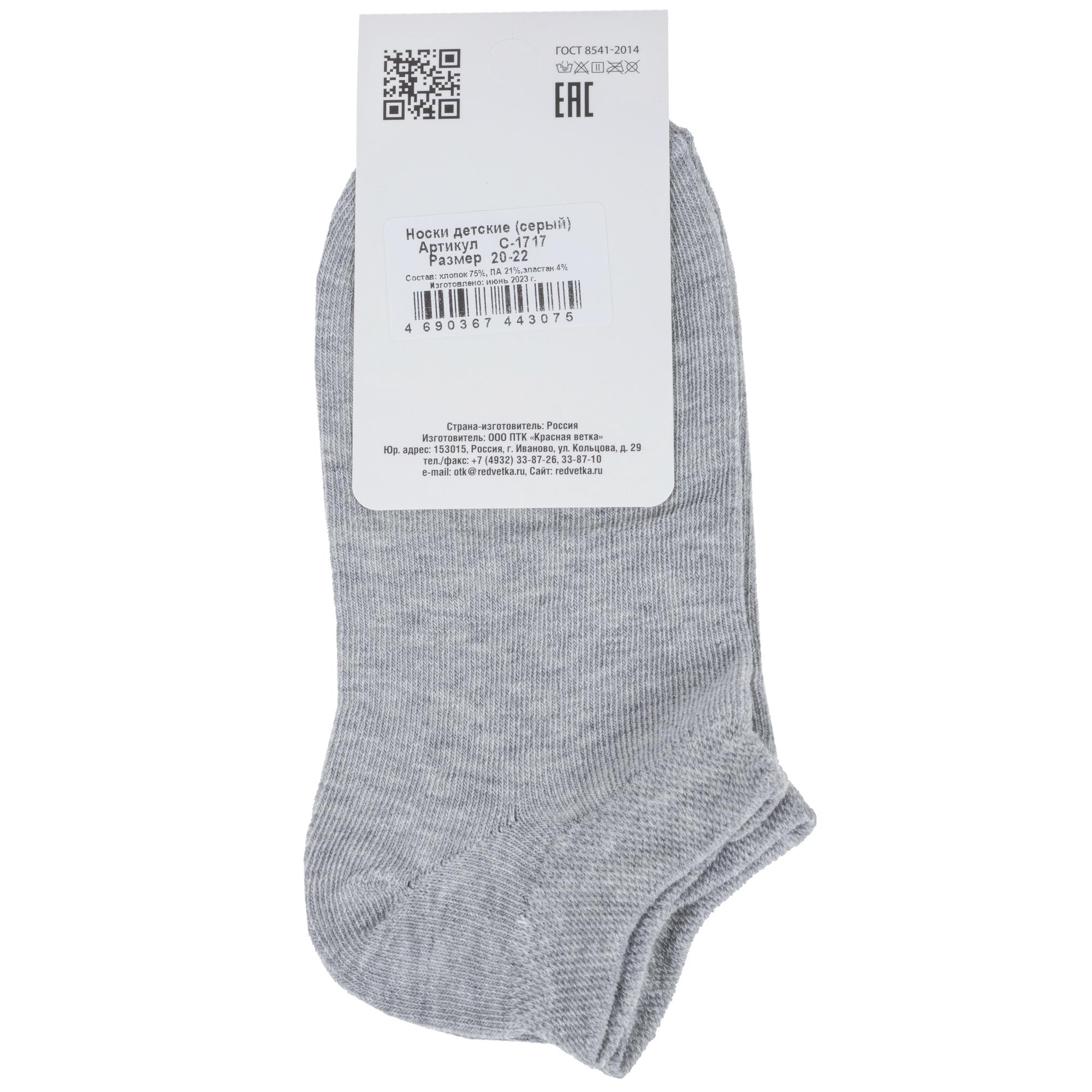 Межсезонные или летние короткие детские носки, цвет серый, классические, возможно бесшовные, принт (рисунок): однотонный, без рисунков/узоров, состав: 75% хлопок, 21% полиамид, 4% эластан, арт. С-1717. Производитель «КРАСНАЯ ВЕТКА» Россия под брендом «Красная ветка».