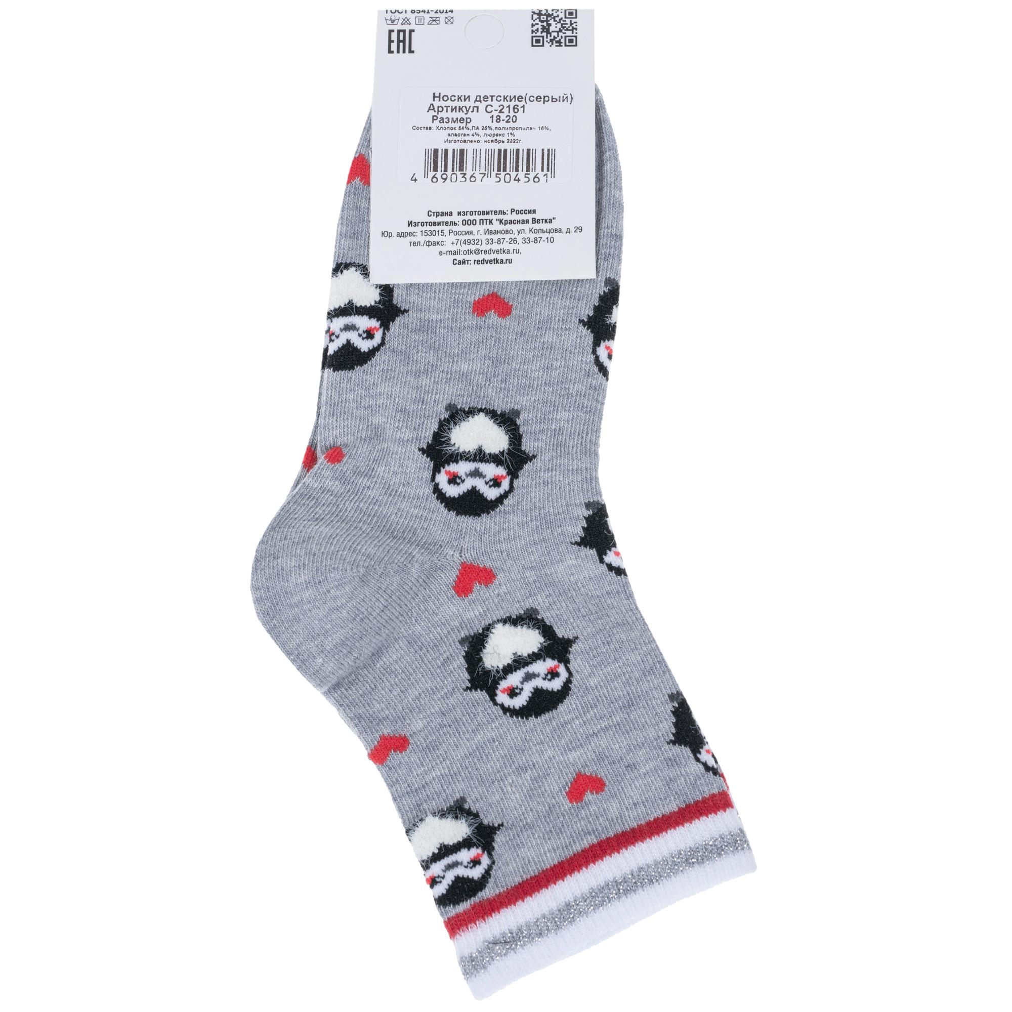 Круглогодичные укороченные детские носки, цвет серый, повседневные, возможно бесшовные, принт (рисунок): сердечки / поцелуи / любовь, контрастные пятка / мысок / резинка, животные, блеск люрекса, с узором, состав: 54% хлопок, 25% полиамид, 16% полипропилен, 4% эластан, 1% люрекс, арт. С-2161. Производитель «КРАСНАЯ ВЕТКА» Россия под брендом «Красная ветка».