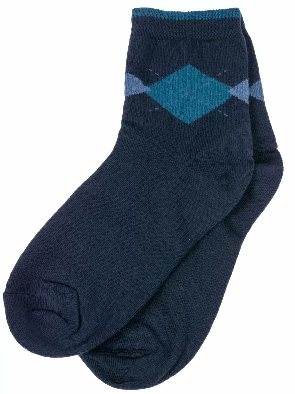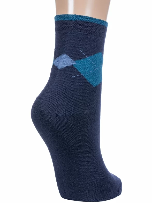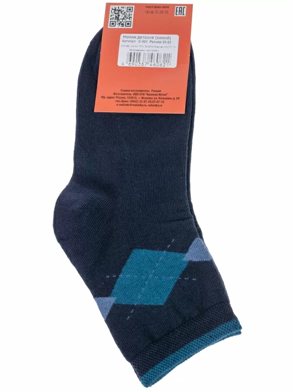 Круглогодичные укороченные детские носки, цвет синий, классические, возможно бесшовные, принт (рисунок): контрастные пятка / мысок / резинка, аргайл, с узором, состав: 75% хлопок, 20% полиамид, 4% эластан, 1% полипропилен, арт. С-521. Производитель «КРАСНАЯ ВЕТКА» Россия под брендом «Красная ветка».