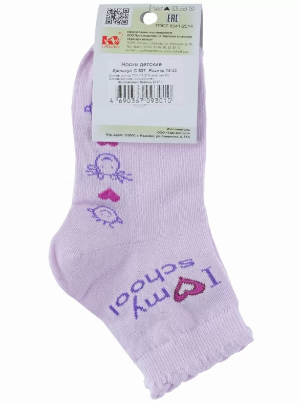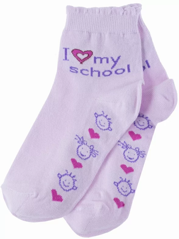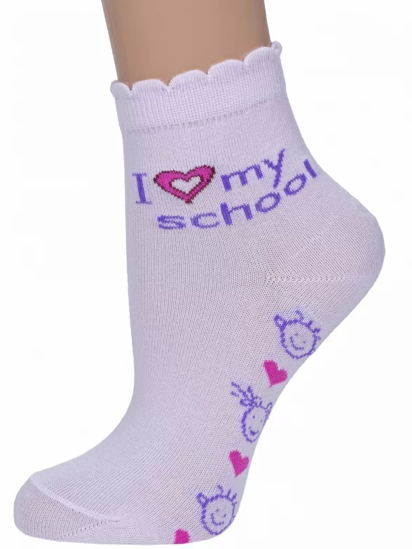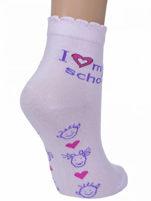 Круглогодичные укороченные детские носки, цвет сиреневый, повседневные, шов обычный (не бесшовные), принт (рисунок): учеба, сердечки / поцелуи / любовь, надписи, с узором, состав: 73% хлопок, 21% полиамид, 6% эластан, арт. С-527. Производитель «КРАСНАЯ ВЕТКА» Россия под брендом «Красная ветка».